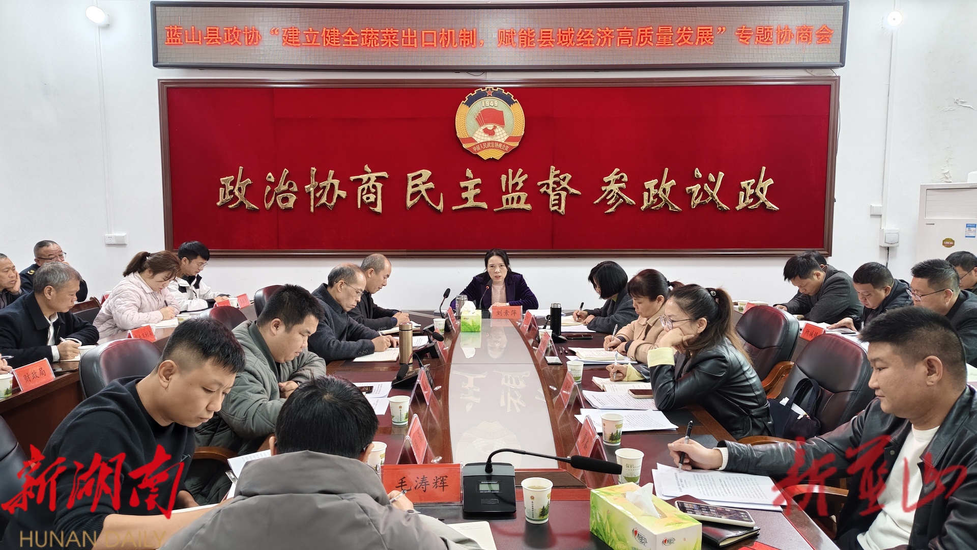 (通讯员 李秋妃) 12月5日上午,蓝山县政协围绕“建立健全蔬菜出口机制,赋能县域经济高质量发展”与“助推秸秆综合利用和精准实施焚烧管控”两大主题,召开专题协商会和界别协商会。蓝山县政协主席刘素萍出席会议并讲话,县政协副主席梁黎超主持会议。