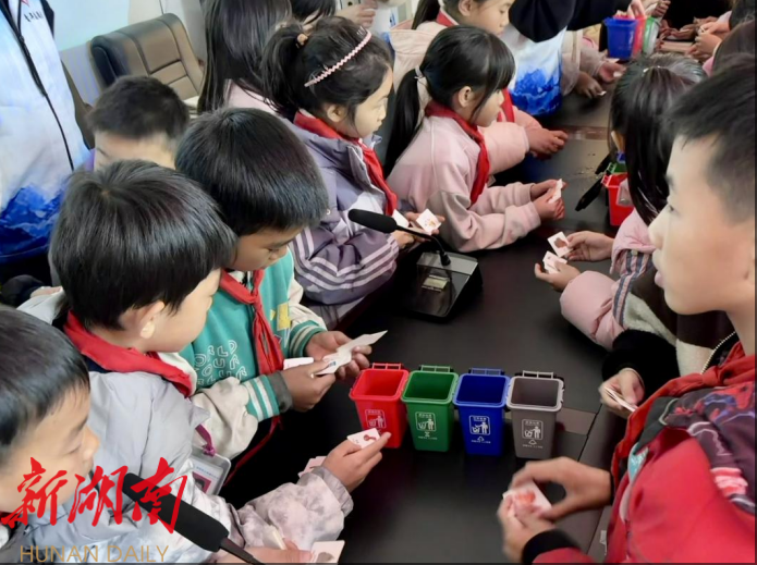 在“长江小卫士特工队”成立仪式上,同学们化身守护江河的“小特工”,环保知识与垃圾分类技能则成为他们的“核心任务”。为强化学习效果,宣讲团精心设计垃圾分类趣味挑战赛:印有塑料瓶、果皮、废电池等图案的卡片被分发给同学们,大家需在规定时间内将卡片投入对应分类垃圾桶。现场同学踊跃举手、争相参与,在欢声笑语中精准掌握了垃圾分类的基本方法。宣讲团还为同学们送上桂阳县垃圾分类宣传手册,鼓励大家成为环保“传声筒”,将绿色理念传递到校园每个角落、每个家庭。