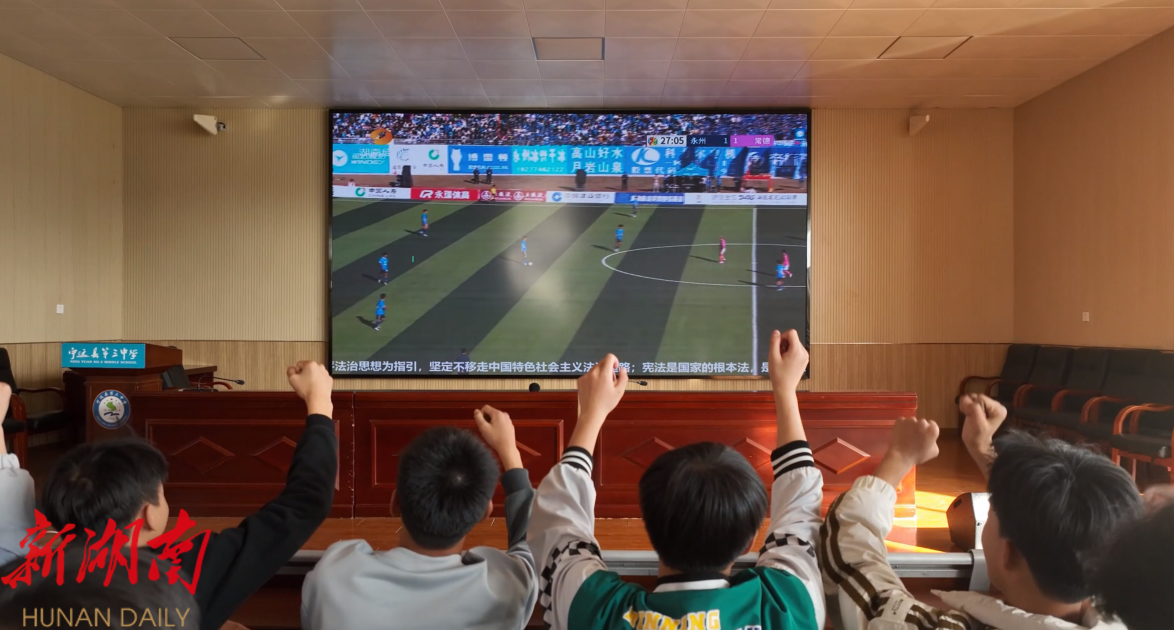 除了日常训练,观看湘超联赛直播成为近期校园足球文化的重要组成部分。每当湘超永州队有比赛,学校都会组织队员们集中观看,让大家近距离感受职业联赛的竞技魅力。赛场上球员们奋勇拼搏的精神,深深感染着每一位学子,也让更多学生燃起了踢好足球、为国争光的梦想。“ 每次看湘超永州队的比赛都特别激动,他们在赛场上的拼搏精神激励着我,我希望以后有机会能像湘超队员一样,站在更大的赛场上踢球。”宁远三中学生球员欧海涛兴奋地说道。