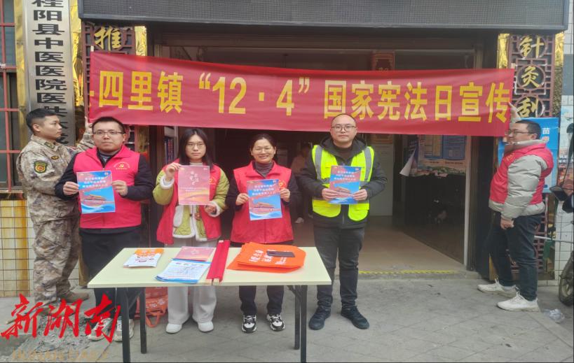 新桂阳12月9日讯(通讯员 苏莹莹 唐文香 )12月4日,为大力弘扬宪法精神,增强群众的法律意识和法治观念,四里镇积极开展“12·4”国家宪法宣传日活动。此次活动在镇卫生院门前举行,由司法所牵头,联合镇禁毒办、退役军人事务办等多部门协同合作,吸引了众多群众踊跃参与。
