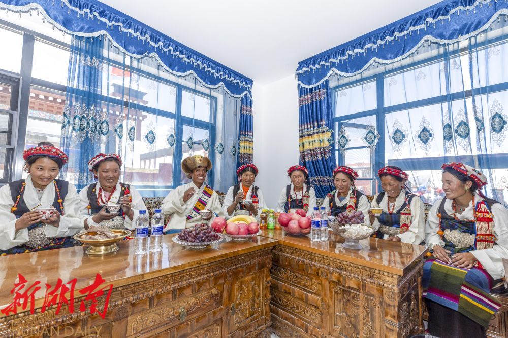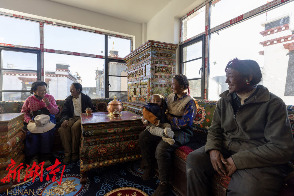 2025年10月24日,定日县加措乡加布村村民强琼(左二)在自家新房中招待乡亲。