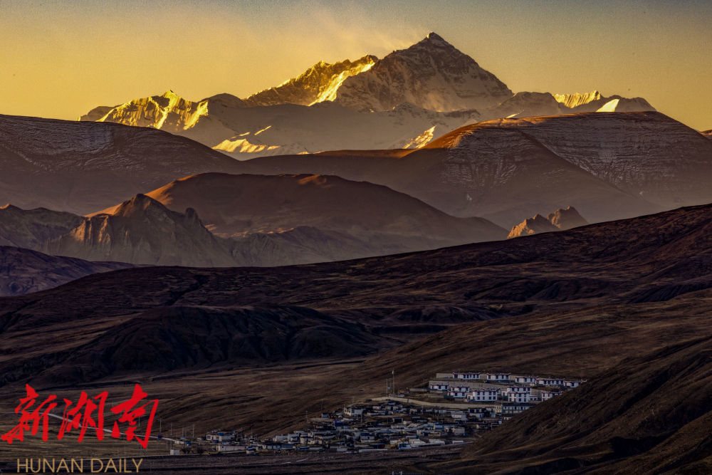 2025年11月23日日出时分拍摄的西藏定日县协格尔镇查那村。村中地势较高处为交付使用的新房。