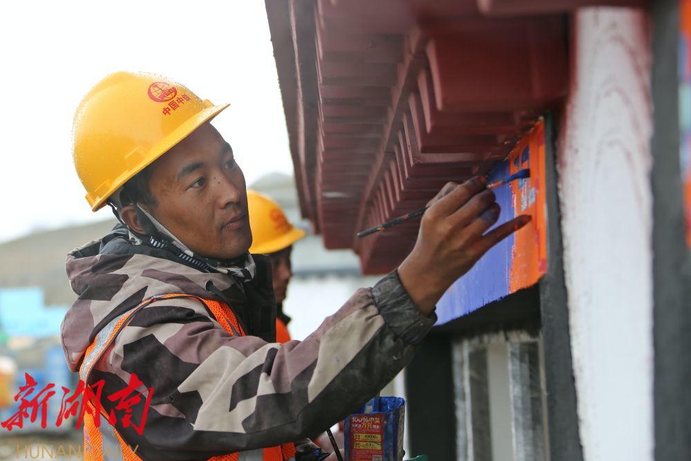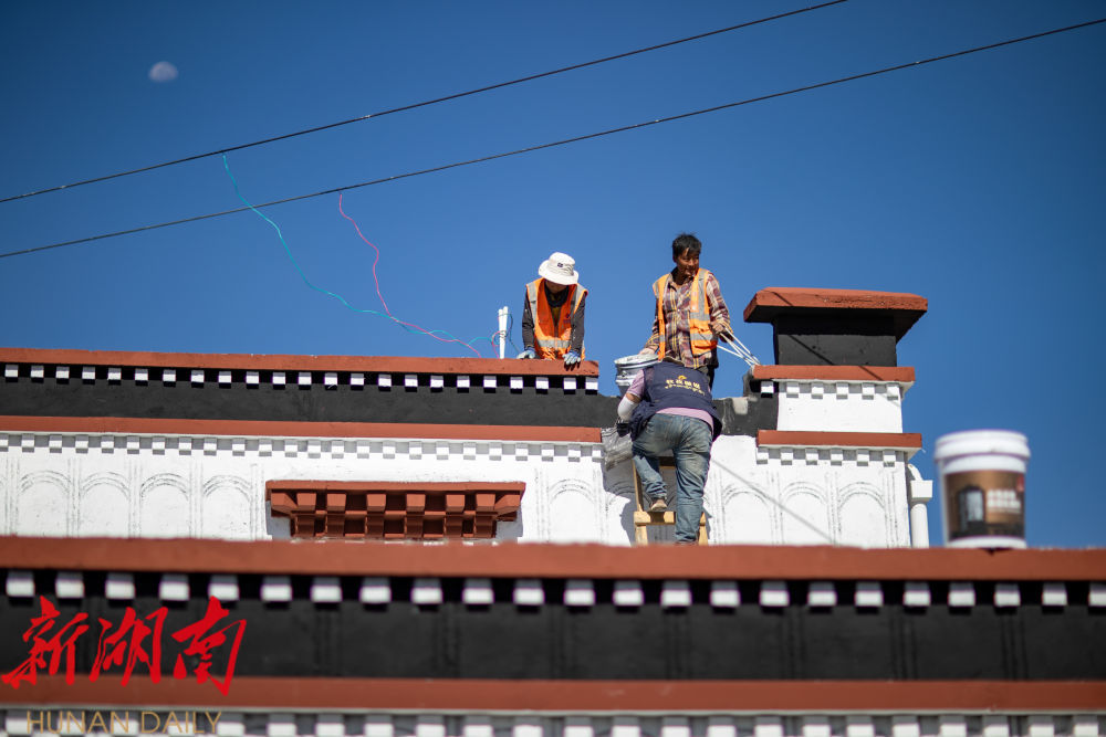 2025年8月11日,定日县曲洛乡措昂村彩绘工匠扎西、旦增贡加、拉巴在工作现场。他们都是本村受灾群众,通过参与新房建设获得劳动报酬。