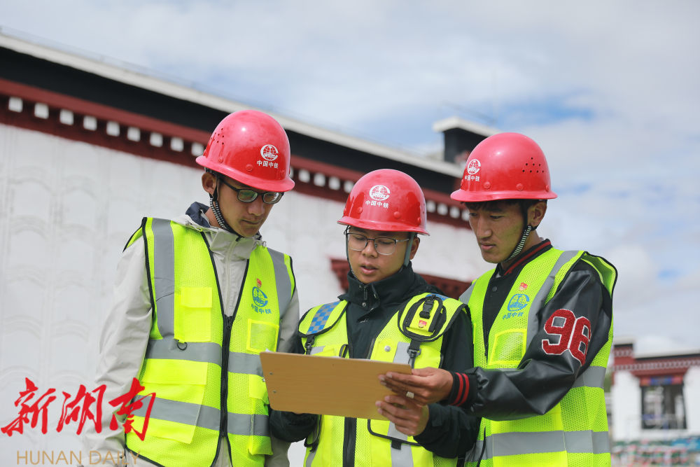 2025年8月10日,技术人员在中国中铁定日县曲洛乡措昂村民房恢复重建项目施工现场商讨方案。