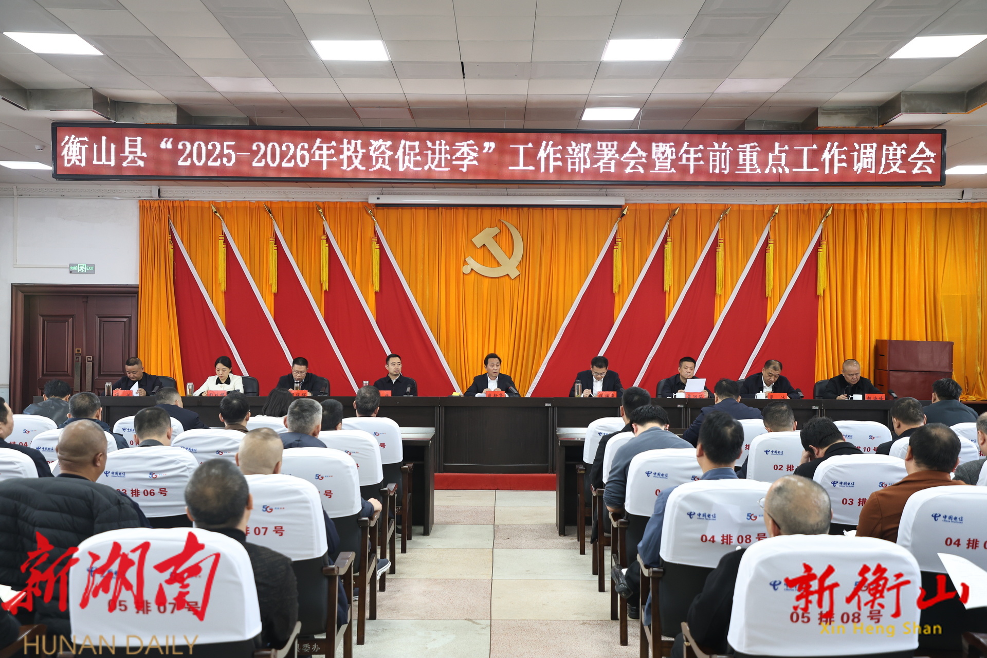 新衡山客户端12月11日讯(记者:周彭斌 旷雨澄)12月11日,衡山县召开“2025-2026年投资促进季”工作部署会暨年底前重点工作调度会。衡阳市政协副主席、衡山县委书记戴新贤出席会议并强调,各级各部门要提高工作效率,凝聚攻坚合力,打响投资促进主动仗,打好年度收官关键战,为衡山高质量发展作出新的更大贡献。县委副书记、代县长陈瑞来主持会议。