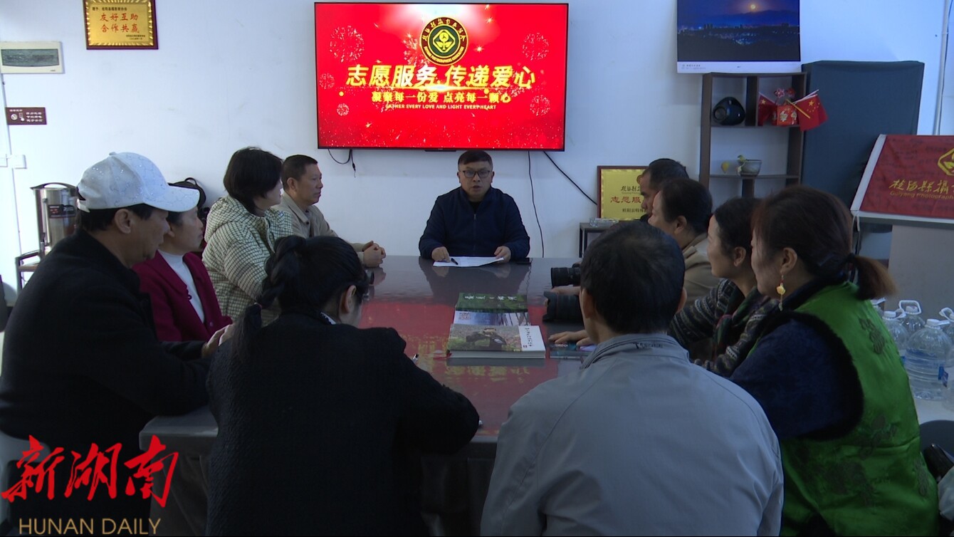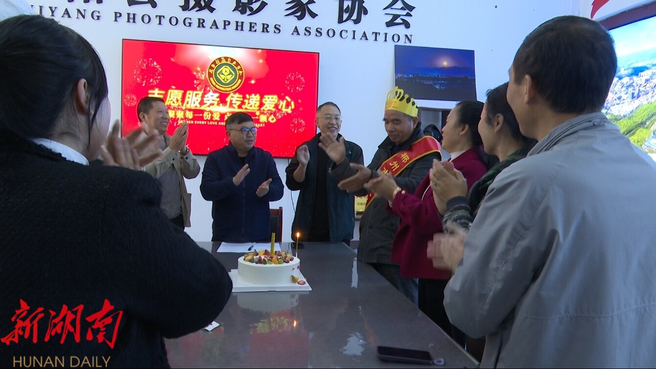 新桂阳12月12日讯(记者 刘克坚 张珂荣 陈英)近日,桂阳县摄影家协会志愿服务队迎来“双喜临门”:他们坚持8年的义务拍摄证件照项目,荣获“郴州市志愿服务之星”称号;而就在表彰当天,恰逢服务队副队长骆宗建60岁生日。一场简单而温馨的生日会,将镜头对准了这位长期奔走山乡的带头人,也映照出一支志愿服务队伍的光影初心与温暖坚守。
