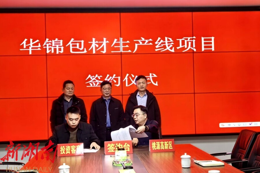 视外桃源客户端12月8日讯(通讯员:文勇君)近日,桃源县招商引资工作再传捷报——华锦包装科技有限公司投资桃源项目签约仪式在桃源高新区成功举行。桃源县城市管理和综合执法局党组书记黄新军、桃源高新区党工委副书记曾羽葳等参加了签约仪式。