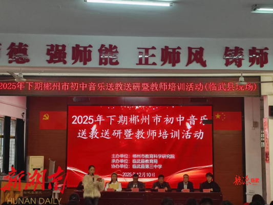 龙源临武客户端12月12日讯(通讯员 李霁 李赟)12月10日,由郴州市教育科学研究院主办、临武县教育局承办的 2025年下期郴州市初中音乐送教送研暨教师培训活动在临武三中举行,活动以“课例展示+互动研讨+专家引领”为主线,为全县中小学音乐教师奉上了一场兼具示范意义与专业价值的教研盛宴。