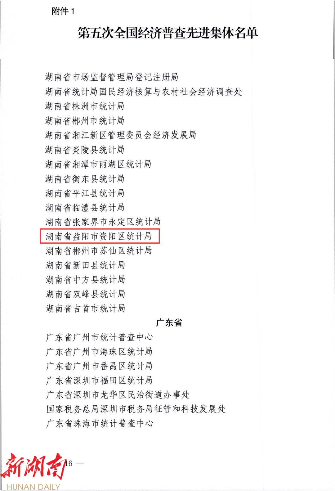 日前,国务院第五次全国经济普查领导小组发布《国务院第五次全国经济普查领导小组关于表彰第五次全国经济普查先进集体和先进个人的决定》,授予全国490个单位“第五次全国经济普查先进集体”荣誉称号,授予300名同志“第五次全国经济普查先进个人”荣誉称号。其中, 益阳市资阳区统计局获评“第五次全国经济普查先进集体” 。