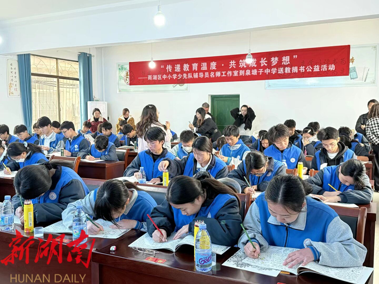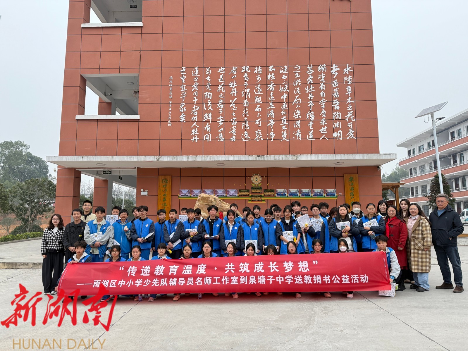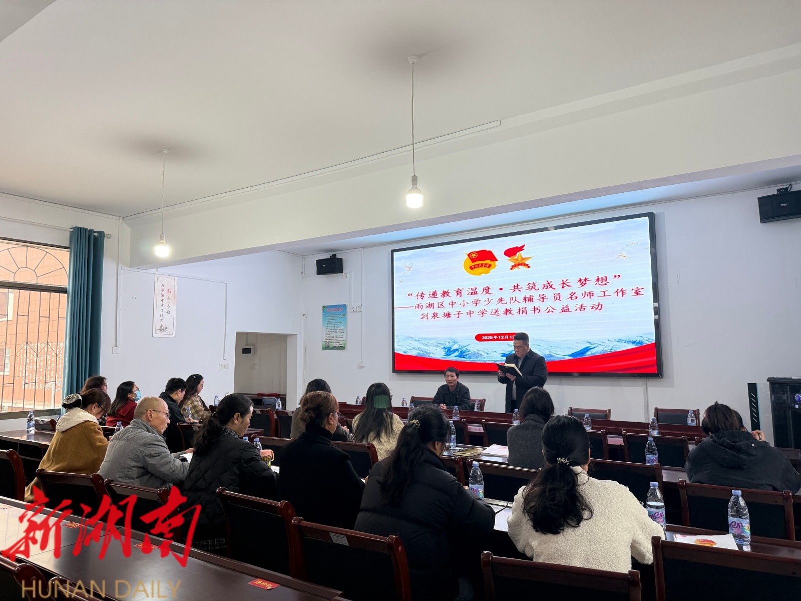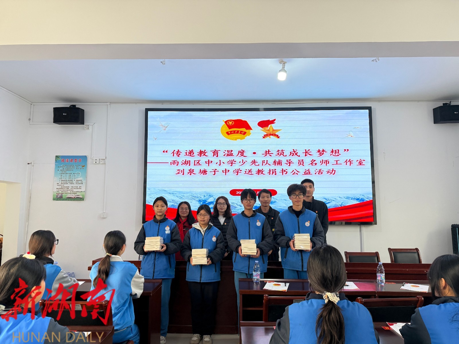 雨湖融媒12月15日讯 (通讯员 龚圆)12月12日,雨湖区中小学少先队辅导员名师工作室与共青团雨湖区教育系统名师工作室联合组织“传递教育温度·共筑成长梦想”公益送教活动,走进泉塘子中学。工作室成员通过示范课程、经验分享、图书捐赠、心理辅导等形式,为该校师生送去优质教育资源和温暖关怀。