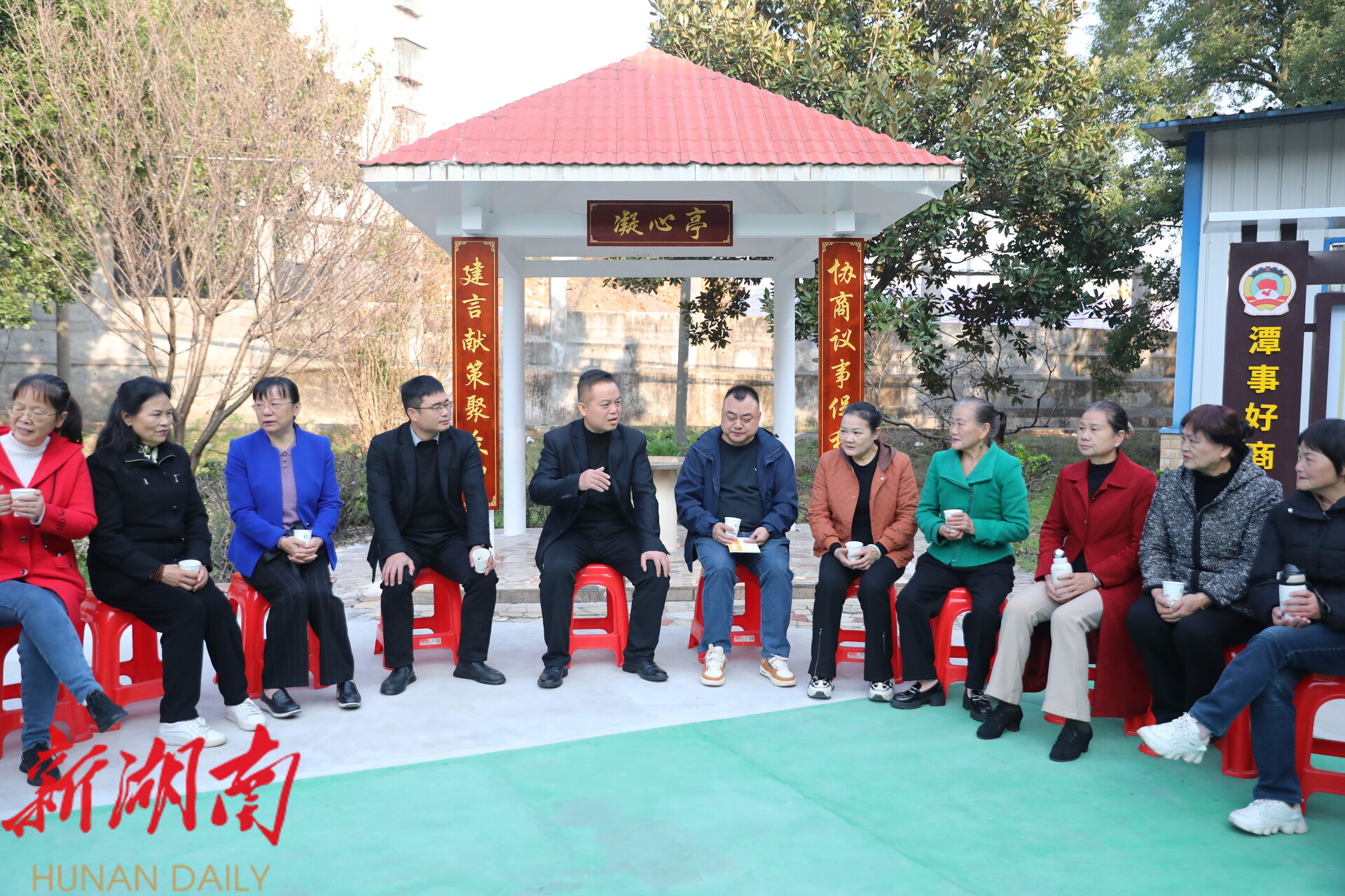 “过去我们多在会议室议事,如今平台就设在群众身边。”先锋街道党工委副书记张韧感慨地说。先锋街道创新打造“潭事好商量”实体阵地,将委员工作室前移至平安小公园,这一转变不仅实现了履职阵地的前移,更打破了空间隔阂,让群众在散步、休憩中就能参与协商。“凝心亭”下,公示栏上委员轮值信息清晰可见,“码上直通车”二维码随手可扫,真正实现了“众人的事情由众人商量”。