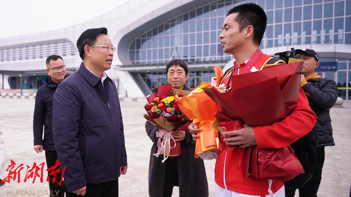 中午12时42分,刘卫一走出洞口高铁站,便受到了大家的热烈欢迎。吴韬与刘卫亲切握手,关切地 询问他的比赛历程、训练艰辛及赛后身体恢复情况,认真倾听他在备赛期间的难忘经历与成长感悟。吴韬高度赞扬刘卫在赛场上展现的自强不息、顽强拼搏精神 。他指出,刘卫用汗水浇灌梦想,以毅力挑战极限,在全国性赛事舞台上展现了我县残疾人运动员的昂扬风采,为家乡争了光、添了彩,是全县人民学习的榜样。