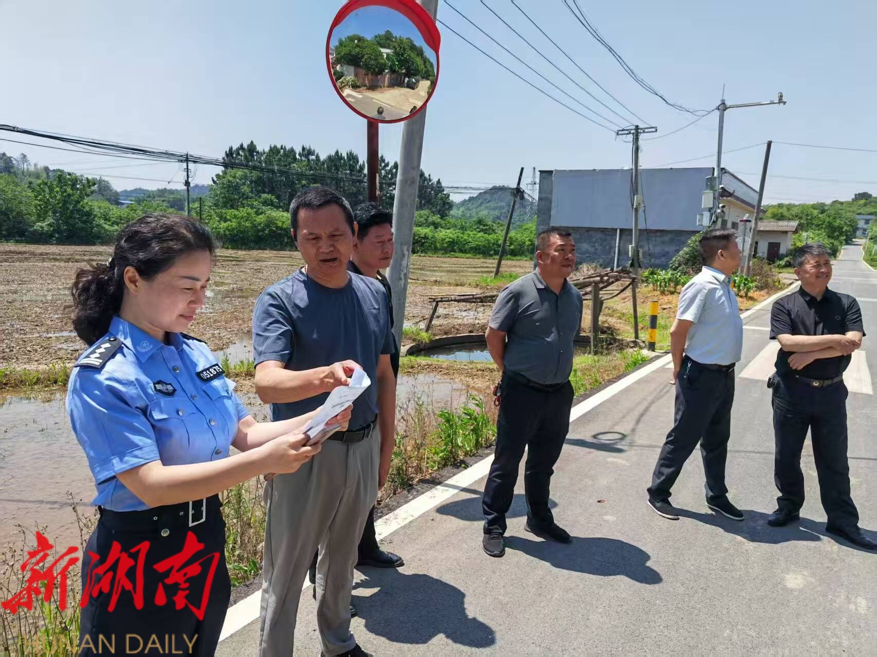 刘志宇代表(左二)与交警队负责人 一起察看长龙学校安全设施安装情况。