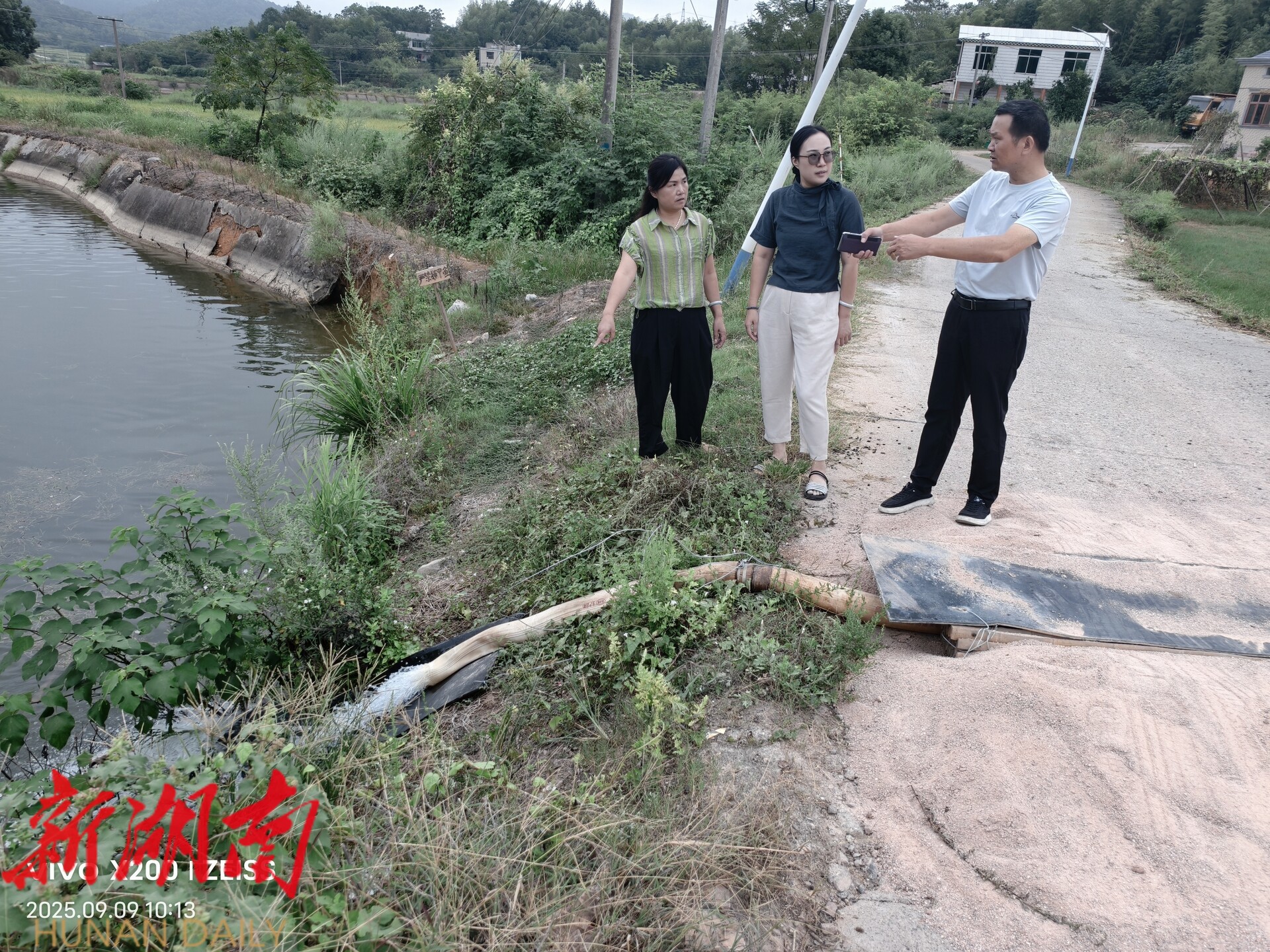 刘志宇代表(右一)在仙女村察看受灾情况并发动爱心企业捐赠抗旱物资。