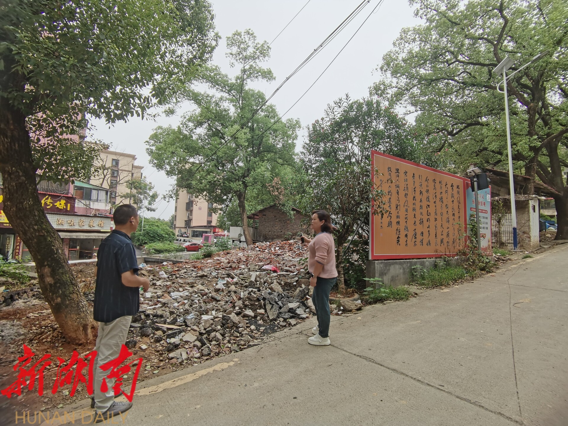 刘志宇代表(左一)在与红旗社区党总支书记在平整后的垃圾池上规划如何建成居民健身场地。