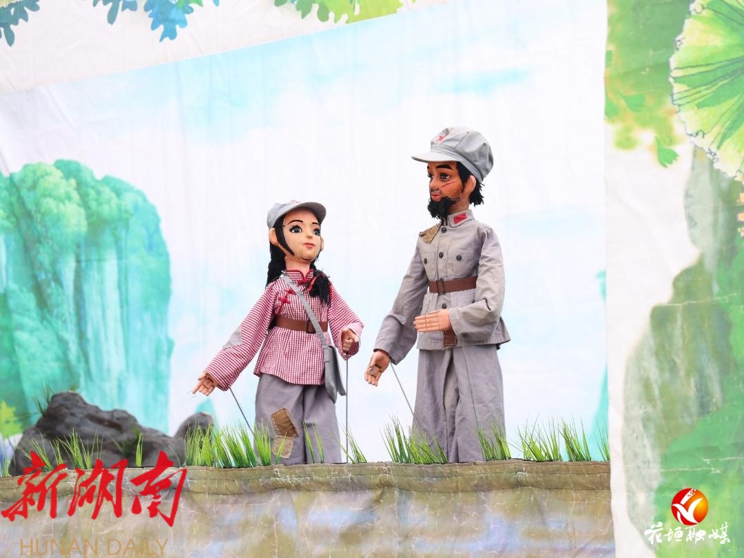台上,节目精彩纷呈:木偶剧《金色的鱼钩》在艺人指间生动演绎长征路上红军战士的坚韧、牺牲与互助精神;竹笛声悠扬,《唱支山歌给党听》的旋律缓缓流淌心间;花鼓戏《刘海砍樵》一开嗓,熟悉的乡音乡韵便点燃全场热情;木偶舞蹈《快乐的小和尚》《农乐舞》更让非遗艺术显得俏皮活泼,充满生气。