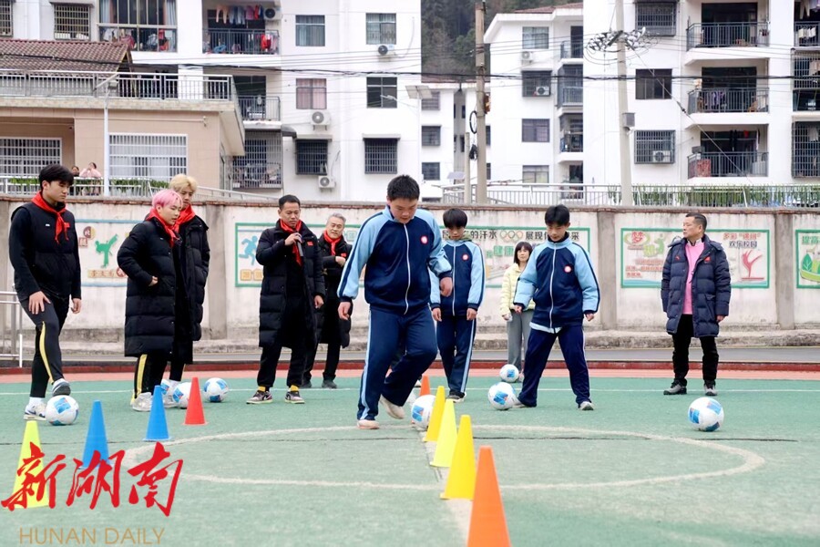 捐赠过程中,湘超常德队队员现场开展体育教学互动,细致示范足球基础动作,耐心指导同学们规范发力技巧,与孩子们亲切交流、欢乐互动,整个操场充满欢声笑语。队员们纷纷表示,希望通过此次活动,让乡村孩子切实感受到运动的快乐,激发大家参与体育锻炼的热情,帮助孩子们养成强健体魄,以更饱满的状态投入学习生活。