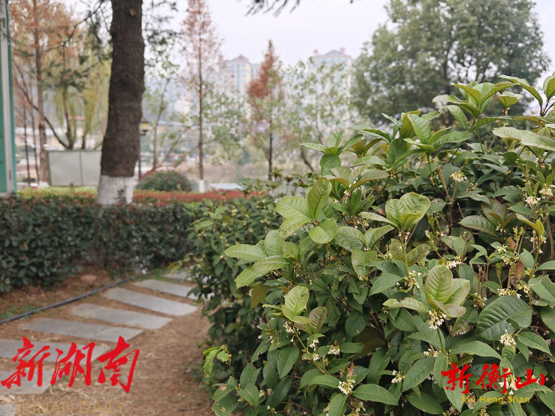 新衡山客户端12月18日讯(记者:何思霞 刘星语)本该是腊梅独俏的时节,我县街头巷尾的桂花树,却再度吐露芬芳。一簇簇金粟般的花朵掩映在墨绿的叶间,随风送来阵阵清甜,为冬日平添了一抹春日的温润与诗意。