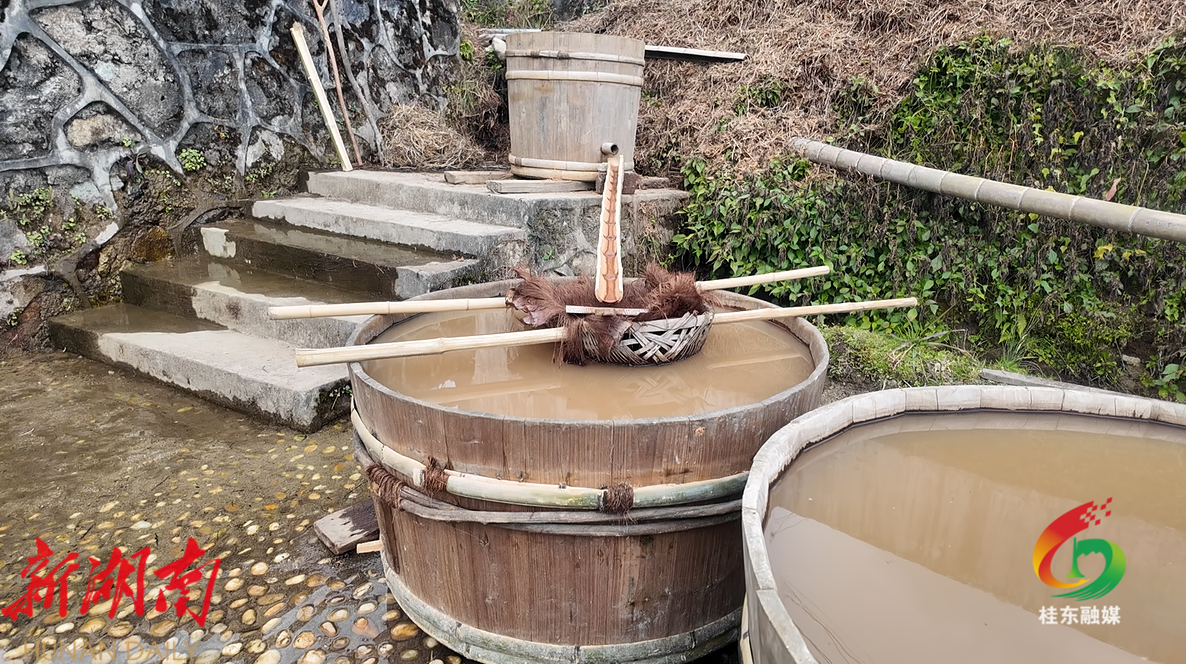 县融媒体中心主持人余妍:你看,经过捶打和初步过滤,我们的第一步就已经完成了。那接下来才是真正考验耐心的时刻,因为我们的蕨根浆要制作成蕨根粉还需要经历两次的沉淀,才能够真正得到最终需要的蕨根粉。