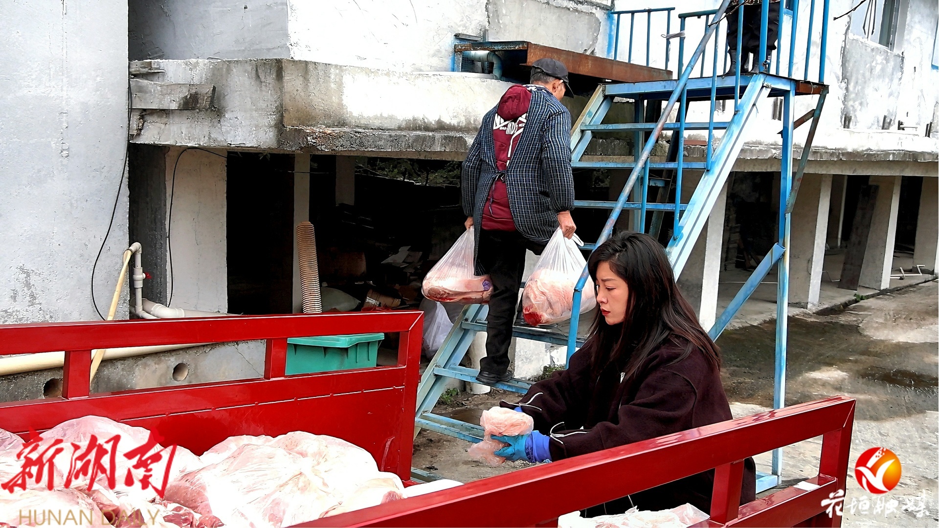 石海燕与工人一同卸载新鲜猪肉(本组图片均由邓雨露、覃文湘拍摄)