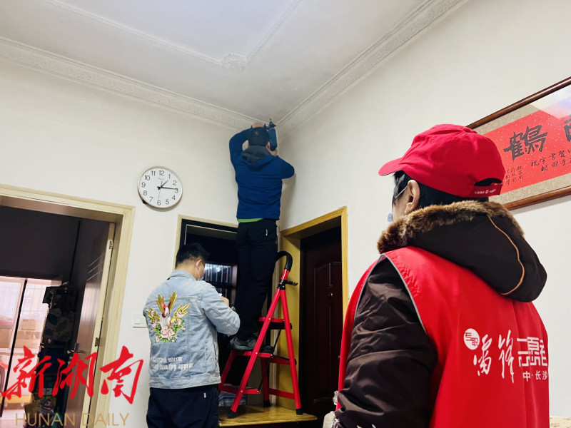 社区工作人员到独居老人家检修智能烟感报警系统。 均为李卓 罗孟 摄影报道