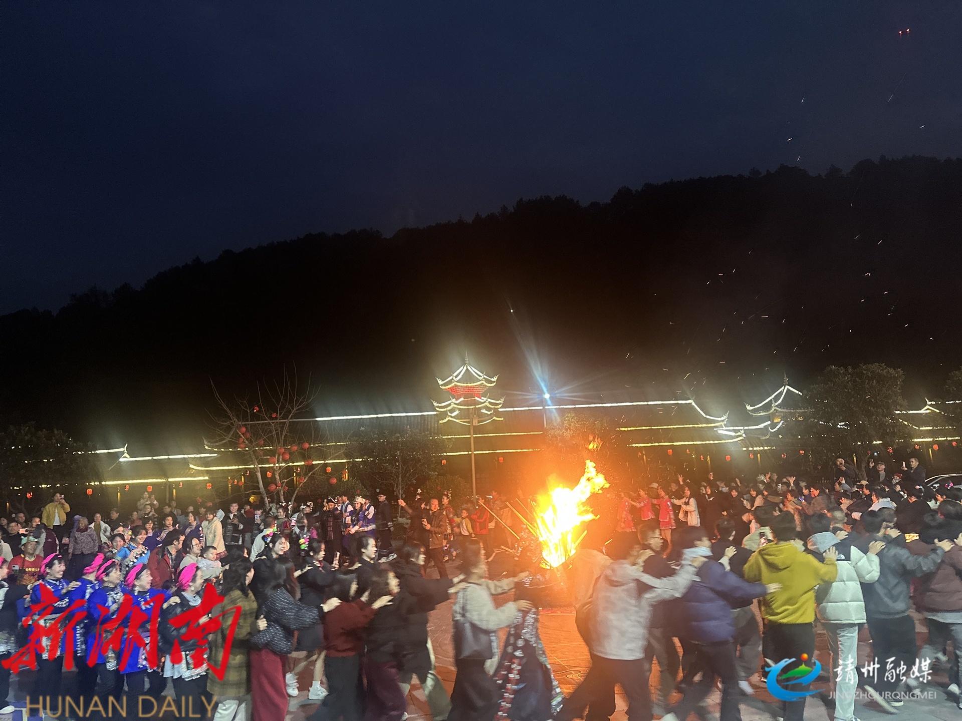 夜幕降临,合拢宴上,各式菜肴摆上长桌,游客们围桌而坐,依次体验“高山流水”的敬酒礼仪, 觥筹交错间,拉近了彼此的关系。随着篝火点燃,熊熊火焰中,身着盛装的侗家儿女与游客围着篝火载歌载舞, 将现场气氛推向高潮,共同沉浸在欢乐祥和的节日氛围中。