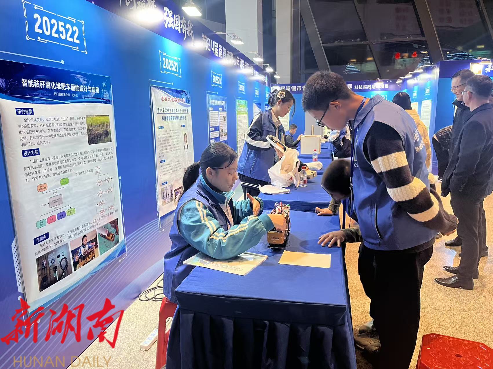 12月20日的公众展示环节,市科技馆内参观者络绎不绝。在22号展位前,文令仪与前来观摩的孩子们亲切互动,用生动易懂的语言讲解作品功能,将科技创新与农业生产、环保实践紧密结合,激发了在场观众对科学探索的浓厚兴趣。