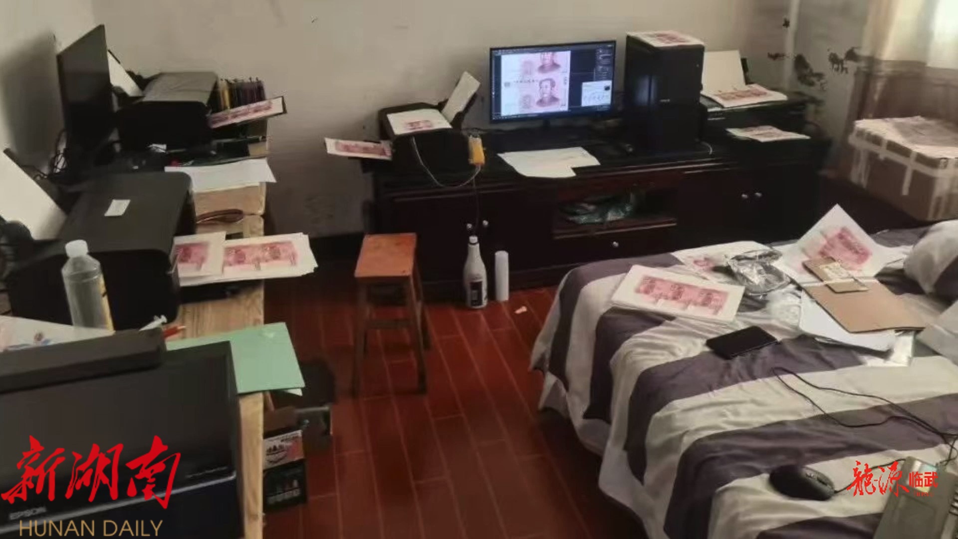 这里是临武县与桂阳县交界处的一处偏僻村宅。从外看,它与普通农居并无二致,但走进二楼房间,画面却令人心惊——数台打印机正在运转,一张张百元面额的假钞随之吐出。房间里还摆放着烫金机、气泵等专业设备,俨然一个微型“印钞车间”。