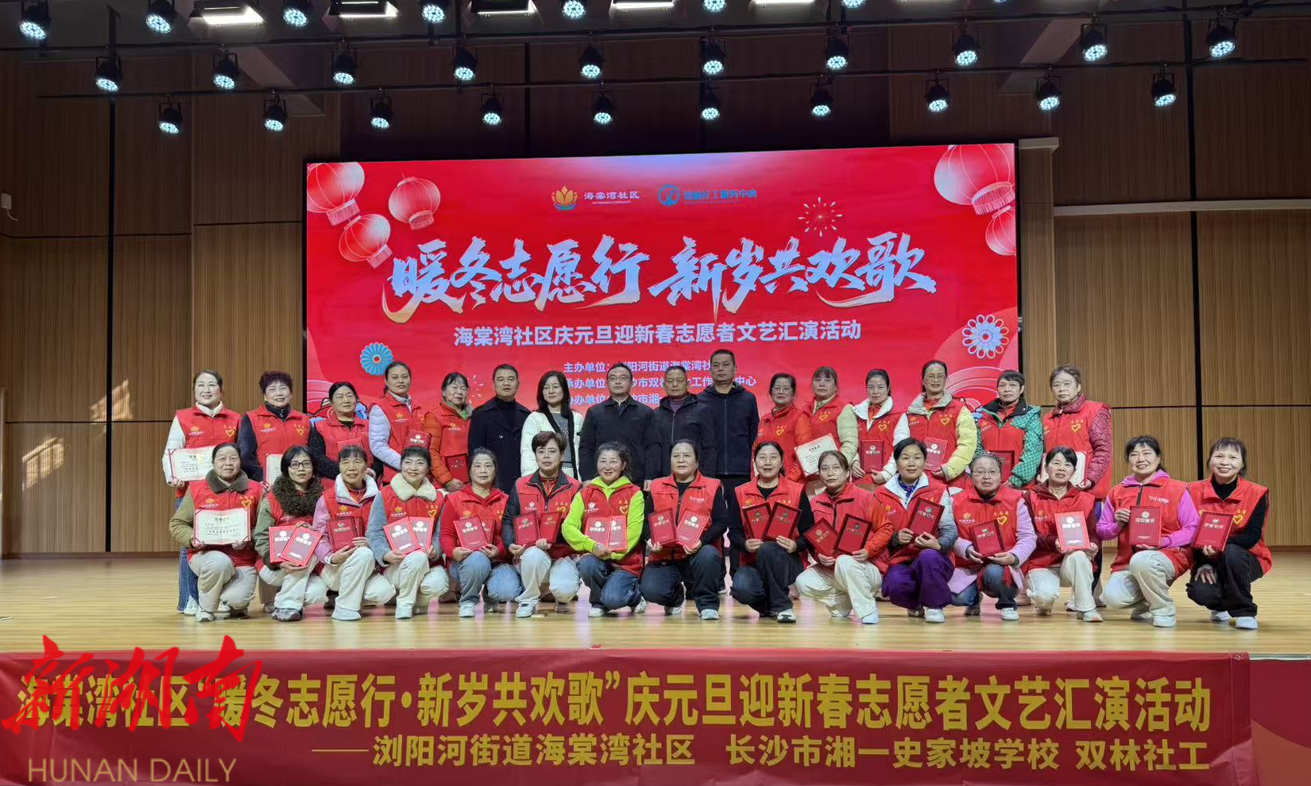 湖南日报·新湖南客户端12月2 8 日讯 ( 通讯员 黄青 ) 12月28日上午,一场温暖而充满活力的文艺汇演在 长沙市 湘一史家坡学校大礼堂精彩上演。本次活动由浏阳河街道海棠湾社区与长沙市双林社会工作服务中心联合策划,携手长沙市湘一史家坡学校共同举办,以“暖冬志愿行·新岁共欢歌”为主题,既是对社区志愿者的一次诚挚致敬,也是深化“社区-学校”共建机制、促进资源共享与文化融合的生动实践。