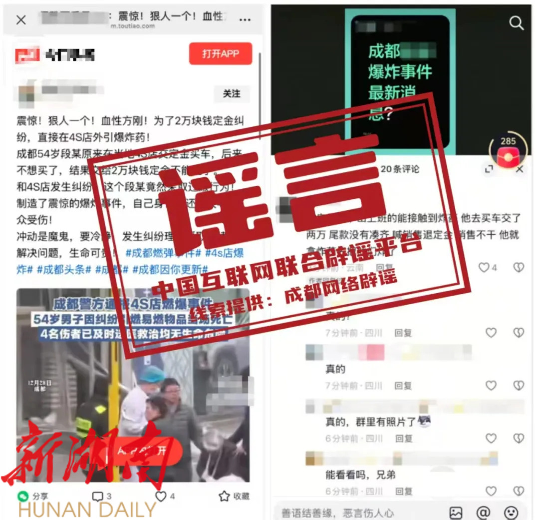 针对以上不实信息,公安机关依法开展核查,涉事网民“曾望明天”(曾某,男,26岁)、“龙大”(龙某,男,30岁)等臆测、编造、散布相关谣言,造成不良社会影响。目前,以上人员已被公安机关依法处理。(来源:“成都网络辟谣”微信公众号)