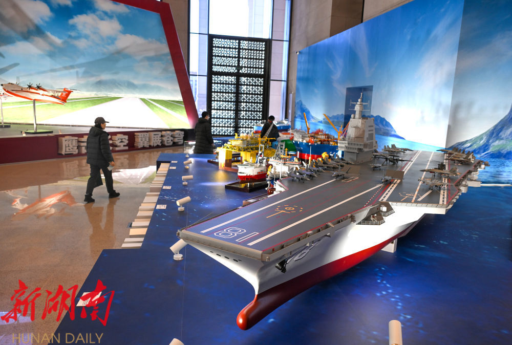 ↑ 这是在“筑基强国路——中国制造‘十四五’成就展”上展出的福建舰模型(12月29日摄)。