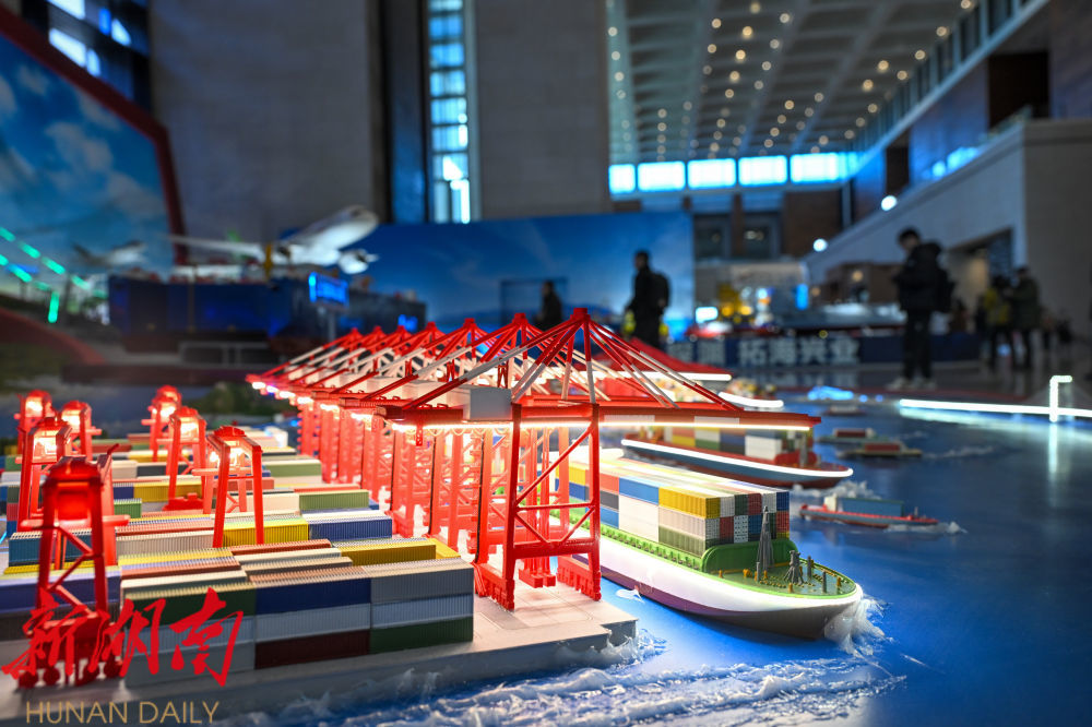 ↑ 这是在“筑基强国路——中国制造‘十四五’成就展”上展出的上海洋山港模型(12月29日摄)。