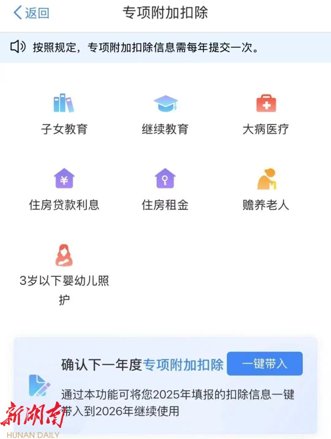 ·若未填过或需新增项目,可在“专项附加扣除填报”模块选择相应项目,扣除年度选择“2026”,根据系统提示进行填报。