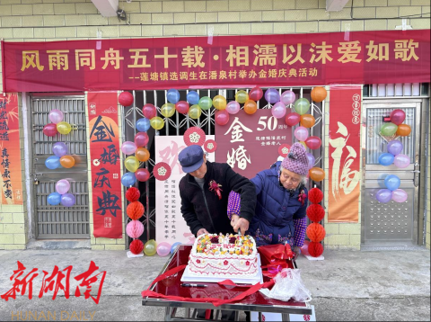 元旦前夕的冬日,阳光和煦,十对白发苍苍的夫妇,胸佩鲜艳的“金婚纪念”红花,在志愿者搀扶下缓缓步入会场。他们平均年龄超过75岁,双手紧握,脸上布满皱纹,也洋溢着羞涩而幸福的笑容。这里没有奢华布置,唯有喜庆背景、温馨横幅和乡亲们热切的目光,共同见证着“风雨同舟五十载·相濡以沫爱如歌”潘泉村“金婚庆典”的温情时刻。这不仅是对10对夫妇相守半个世纪的温暖礼赞,更是莲塘镇在元旦前夕,为弘扬文明新风、致敬乡土深情献上的一份特别的“新年礼物”。