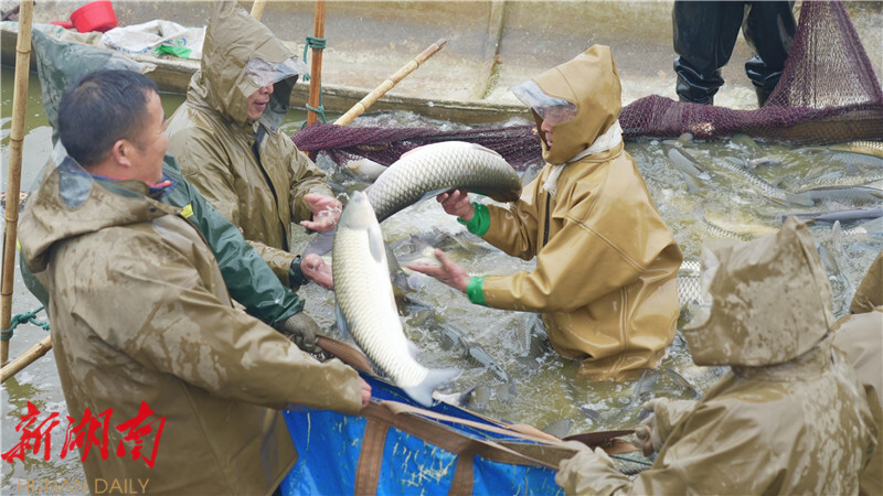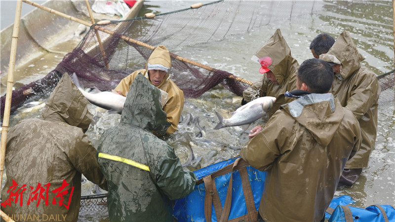 一大清早,中兴渔场北垸村的湖面上已经热闹起来。数十位捕鱼能手身穿防水皮裤,分工协作、默契配合,放线、布网、分段固定、合力拉网,一系列动作娴熟流畅。“一二三……”伴随着整齐的口号声,巨大的渔网缓缓向岸边收拢,一条条膘肥体健的鱼儿在网中翻腾跳跃,鱼尾拍打水面溅起阵阵水花。大家手脚麻利地分拣、装框,再通过吊装设备转运至等候一旁的卡车内,现场一派热火朝天的繁忙景象,每个人脸上都洋溢着掩饰不住的丰收喜悦。
