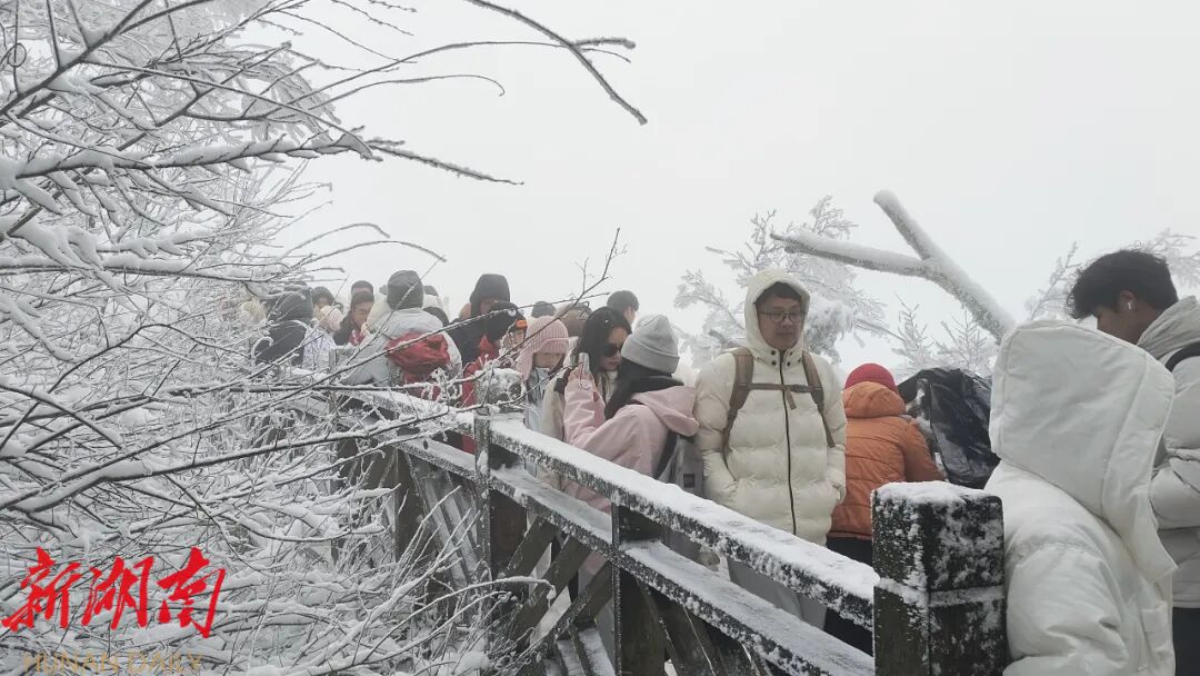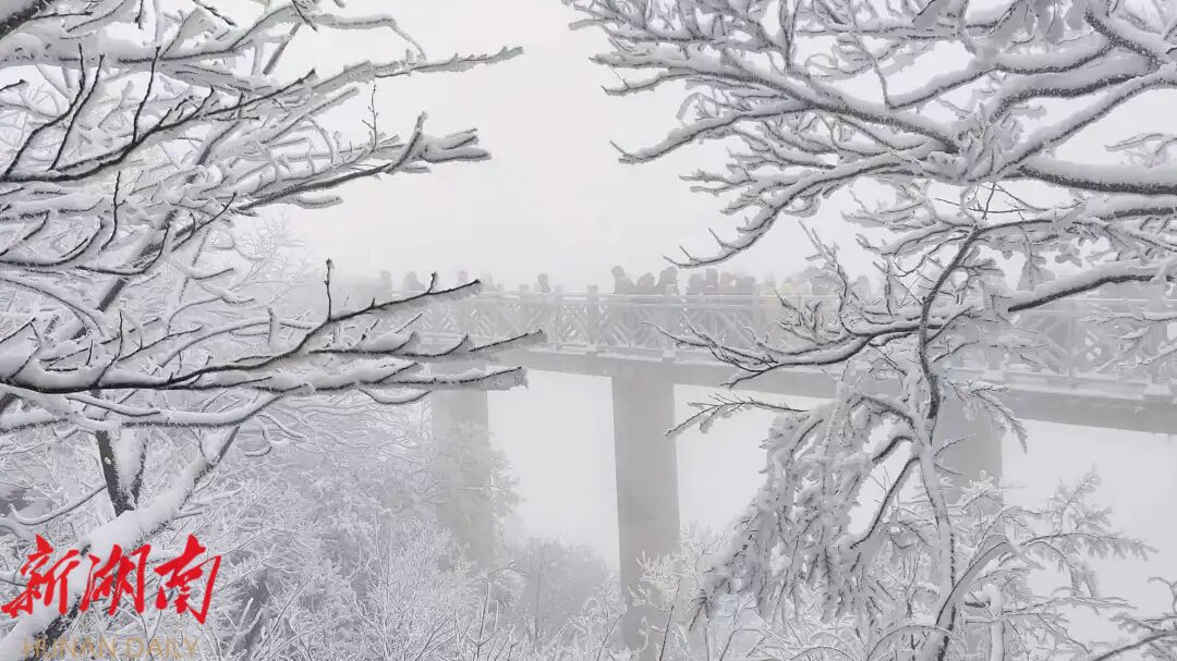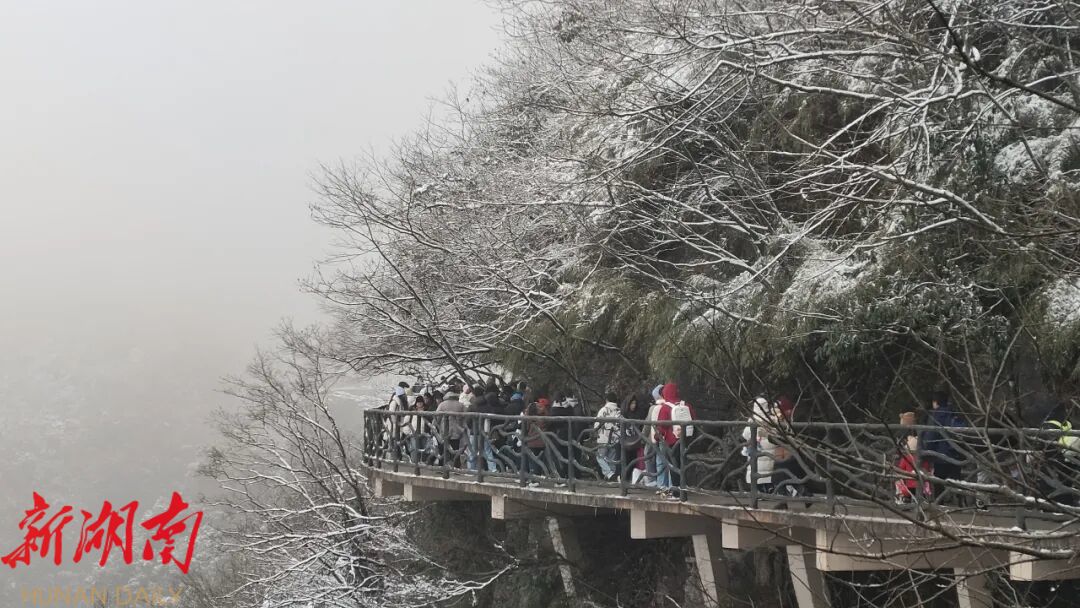 降雪后的天门山,仿佛冬日童话秘境。巍峨的天门洞被白雪点缀,悬崖栈道覆上一层薄雪,山间的树枝缀满冰挂,风过处琼枝摇曳,碎雪飘零,每一处景致都美不胜收。游客们身着厚实的衣物,漫步在积雪覆盖的游道上,或驻足赏景,或嬉戏玩雪,或结伴合影,欢声笑语萦绕山间。不少游客特意奔赴九百九十九级天门云梯,踏着薄薄积雪拾级而上。大家纷纷表示,元旦登高是新年的美好寓意,愿沿着这步步阶梯,开启新一年的顺遂安康,祈愿诸事如意、步步高升。登高望远间,天门山的冰雪全景尽收眼底,壮阔雪景让游客们连连赞叹大自然的鬼斧神工。