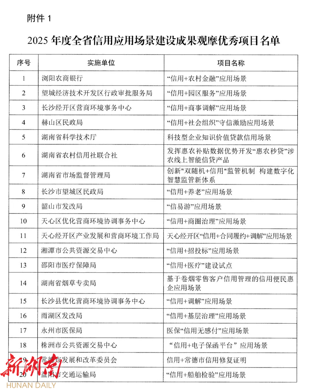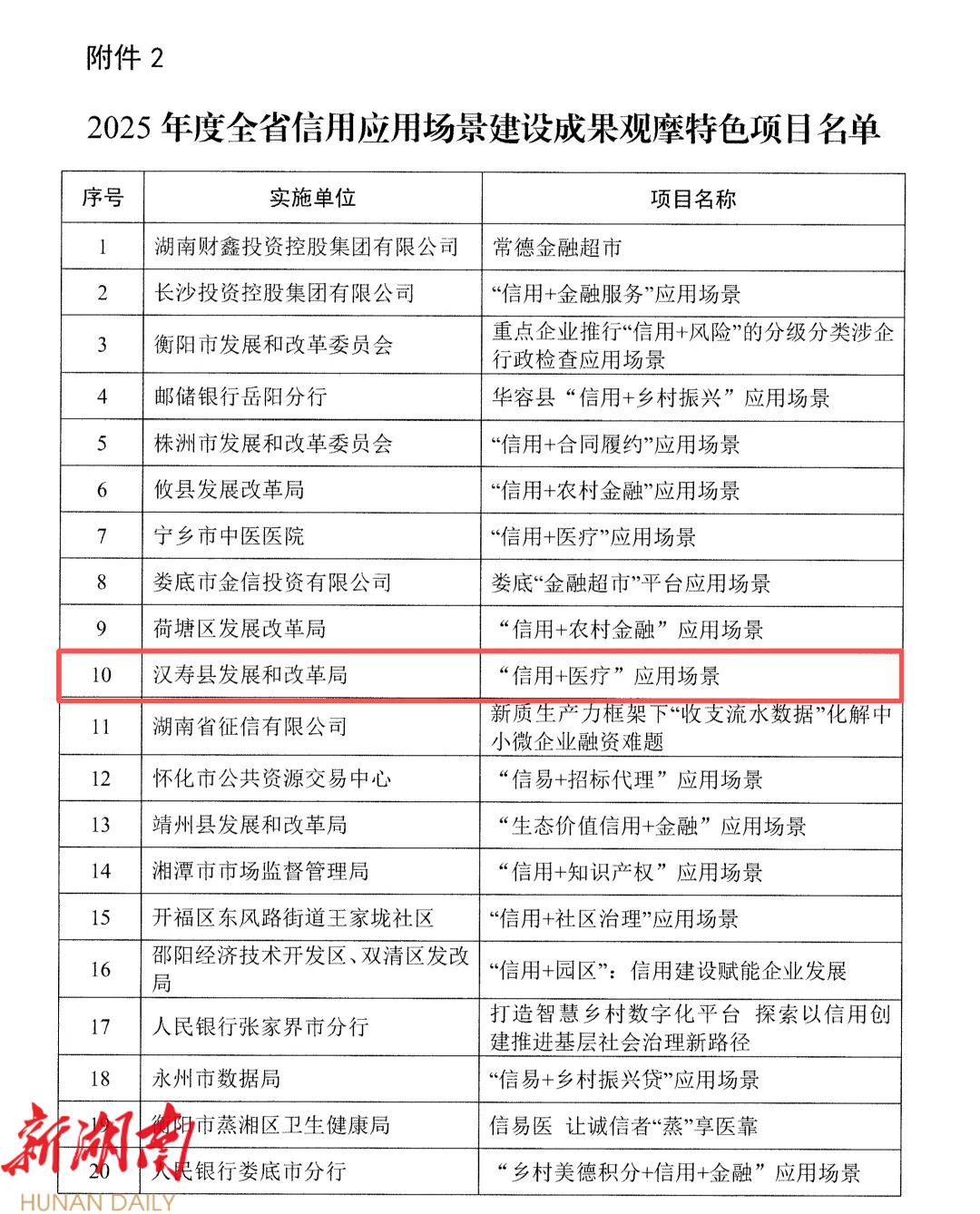 1月4日,湖南省健全社会信用体系联席会议办公室公布2025年度全省信用应用场景建设成果观摩活动结果。经过两轮专家评审和综合审议,活动共评选出25个优秀项目和50个特色项目,常德市共有5个项目入选。汉寿榜上有名: