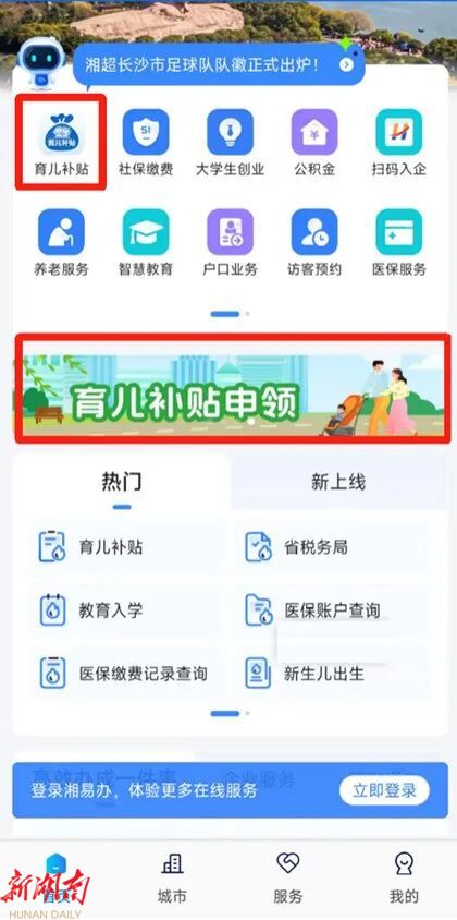 打开“湘易办”APP,点击首页的“育儿补贴”入口,或直接搜索“育儿补贴服务”,即可进入申领页面,根据服务页面指引即可完成申报。