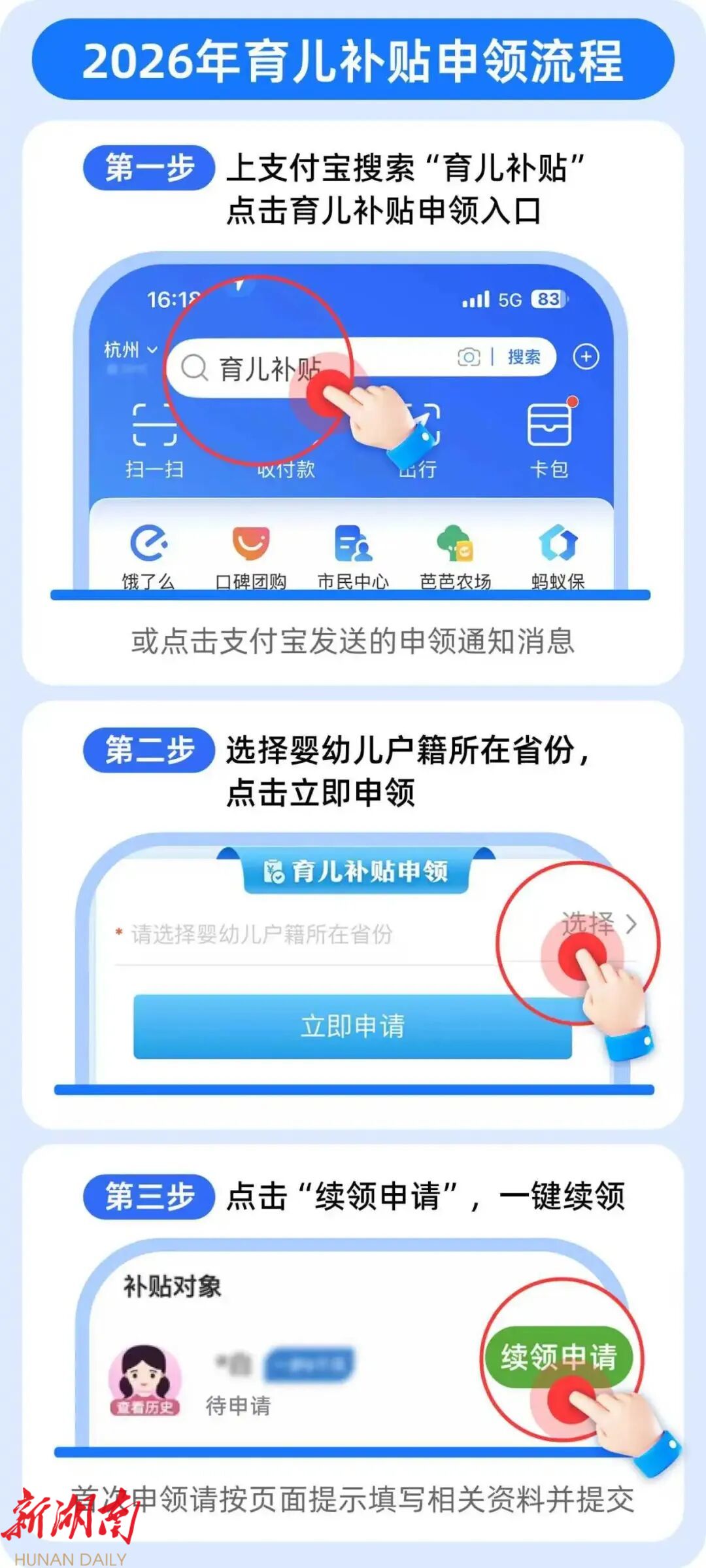 记者今天(5日)从国家卫生健康委了解到,2026年度育儿补贴今天正式开始申领,凡是符合申领条件的婴幼儿,其申领人今天就可以通过支付宝、微信平台的“育儿补贴”小程序,还有婴幼儿户籍所在省份的政务服务平台育儿补贴申领专区线上申领,也可以到户籍所在地的相关部门线下申请办理。