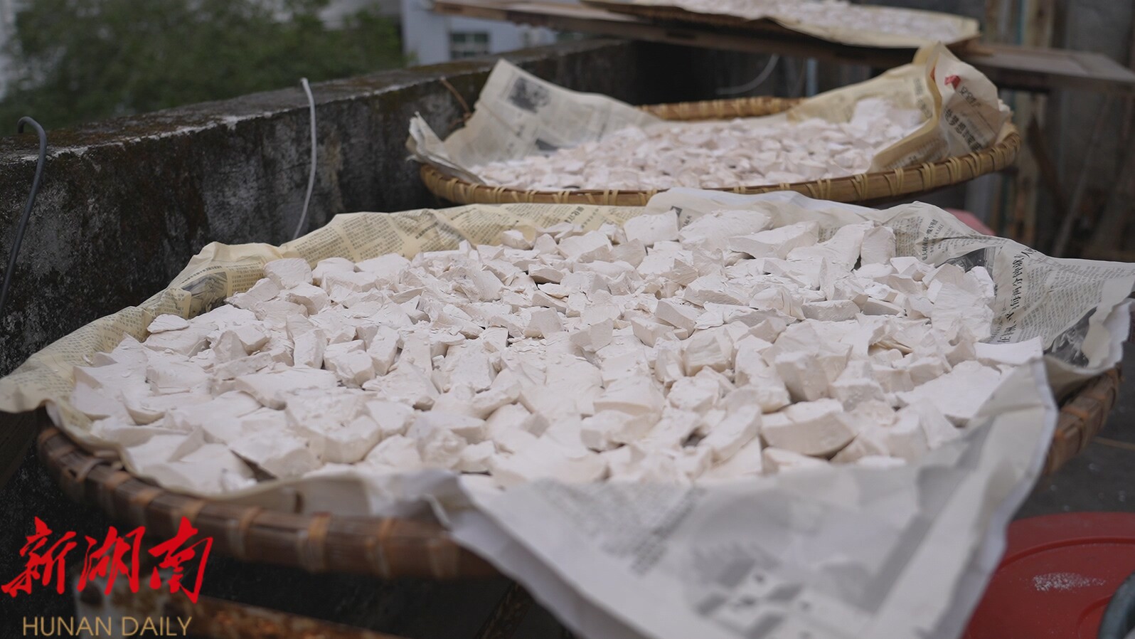 滤去渣滓后,乳白淀粉水被倒进陶制大缸静置一两日。待水面恢复清澈,缸底已然沉淀出厚厚一层雪白细腻的蕨根粉。将凝结的蕨根粉整块挖出,掰成掌心大小的小块,均匀铺在竹匾上,任冬日暖阳晾晒、山野清风吹拂,几日之后,色泽莹白、质地干爽的蕨根粉便制作完成。