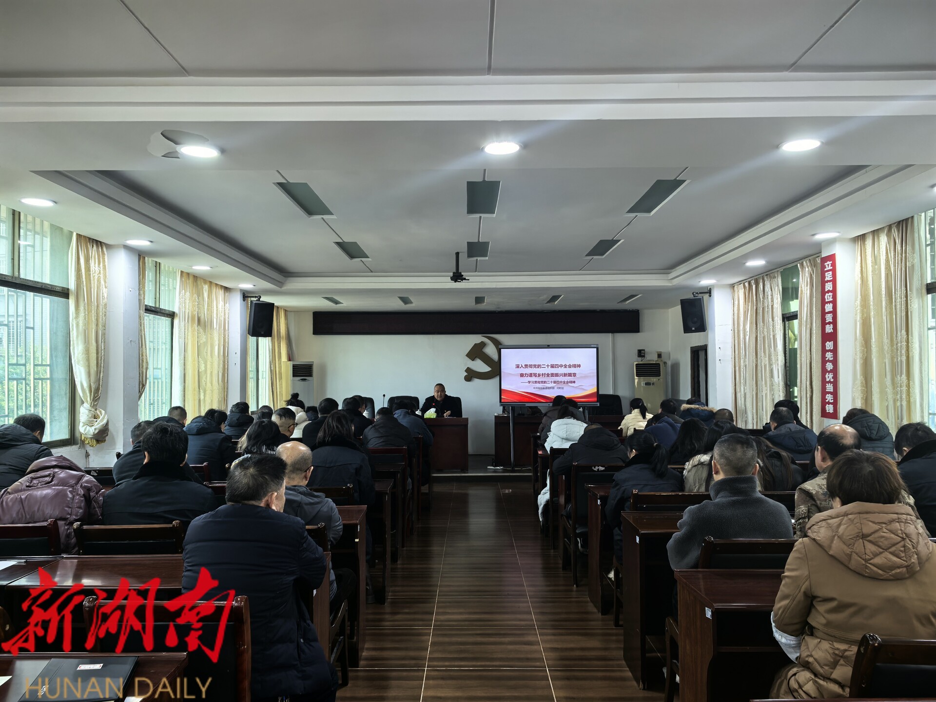 新桂阳1月7日讯(记者 刘娣 )1月6日,学习贯彻党的二十届四中全会精神县委宣讲团报告会在黄沙坪街道举行,县委宣讲团成员何时达作专题宣讲。