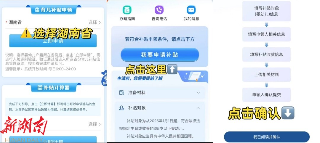 为积极应对人口发展新形势,促进人口长期均衡发展,缓解家庭养育压力,国家在2025年7月正式出台了《育儿补贴制度实施方案》,对符合条件的婴幼儿按照每年3600元的标准发放补贴。据相关工作人员介绍,新一轮育儿补贴主要通过线上渠道申请。市民可在微信、支付宝或“湘易办”小程序上传结婚证、身份证、户口本、婴幼儿出生证明及银行卡等材料,审核通过即可完成申领。