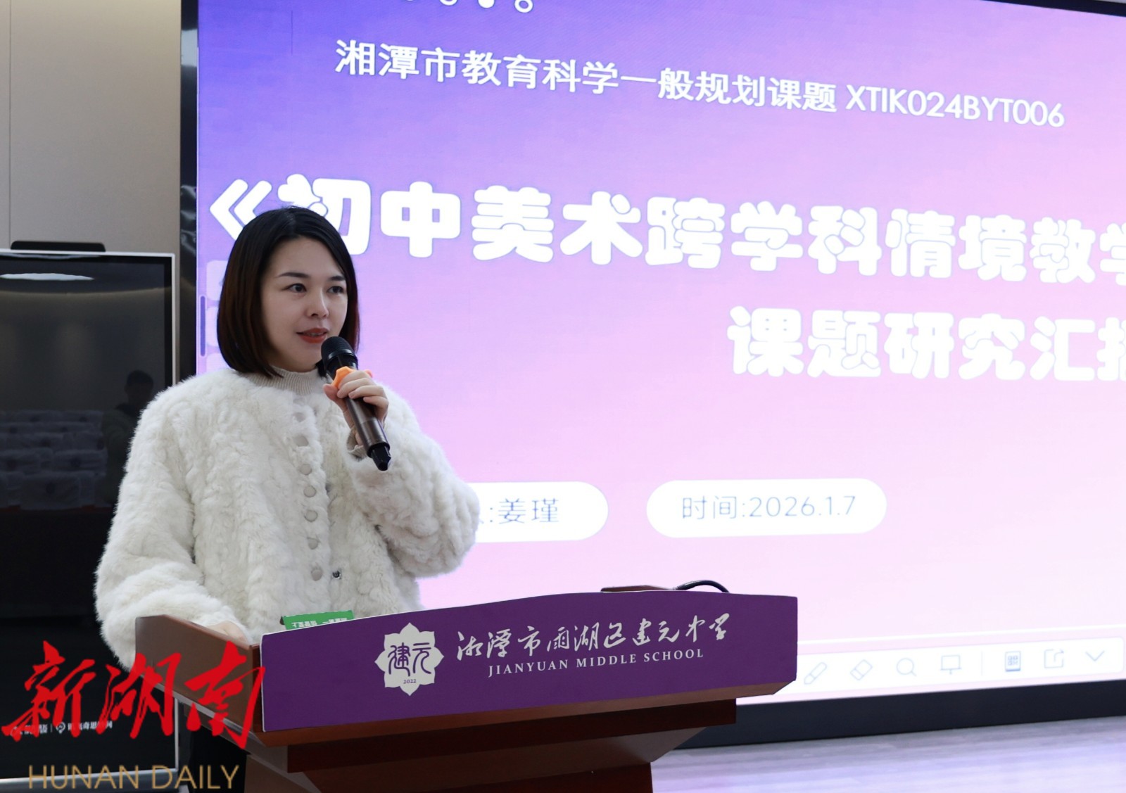首先登场的是建元中学党支部宣传委员姜瑾老师,她带来《初中美术跨学科情境教学的实践研究》汇报。姜老师从师生调研入手,深入分享了美术学科与多学科融合的实践路径与案例开发成果,让美育在跨学科情境中赋能课堂,展现了文科研究的审美融合特色。