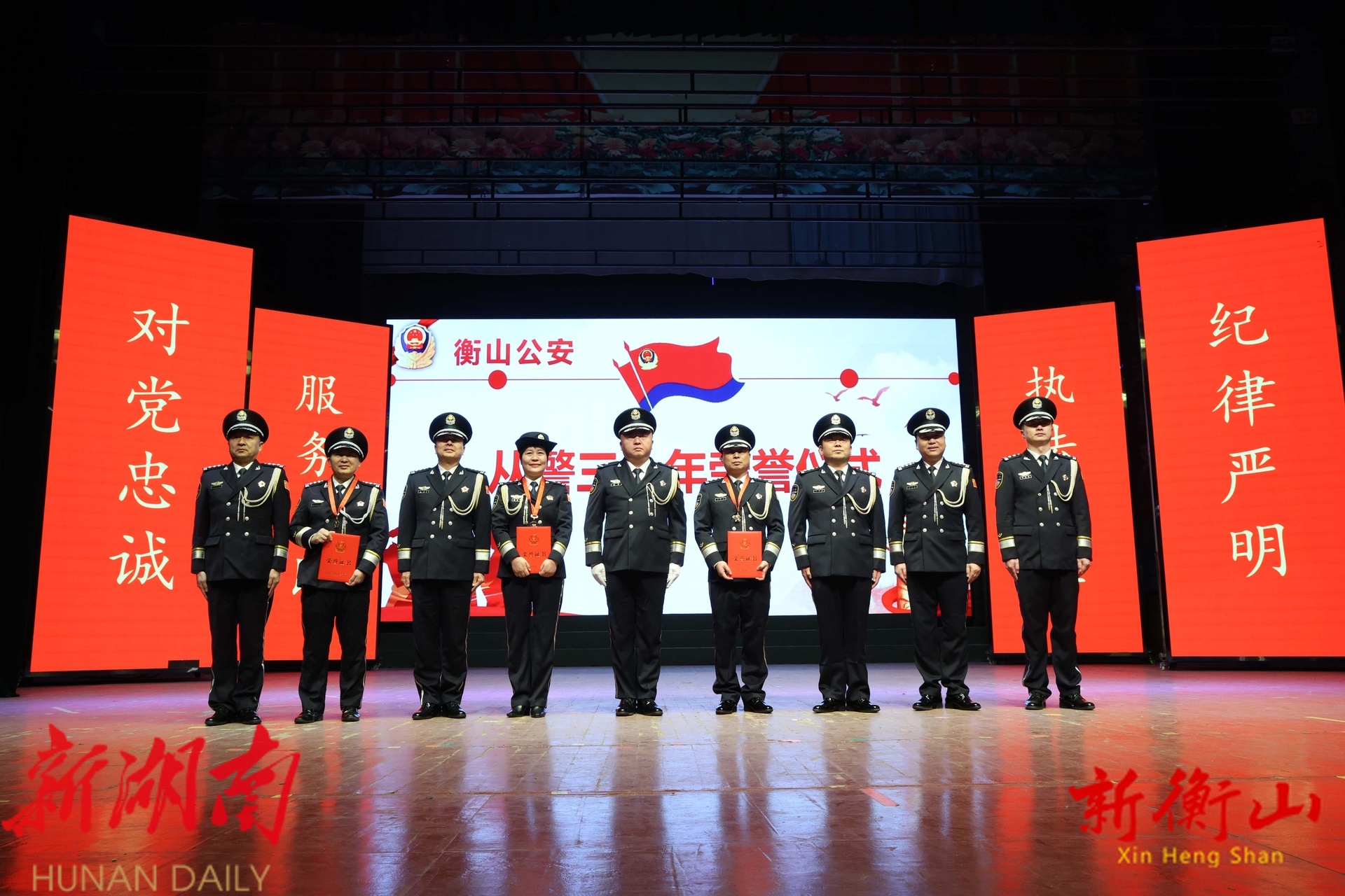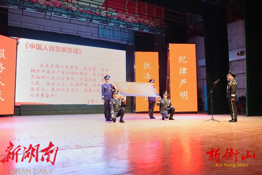 在县剧院举行的颁奖仪式上,全体民辅警面向警旗,举起右手,重温中国人民警察誓词。
