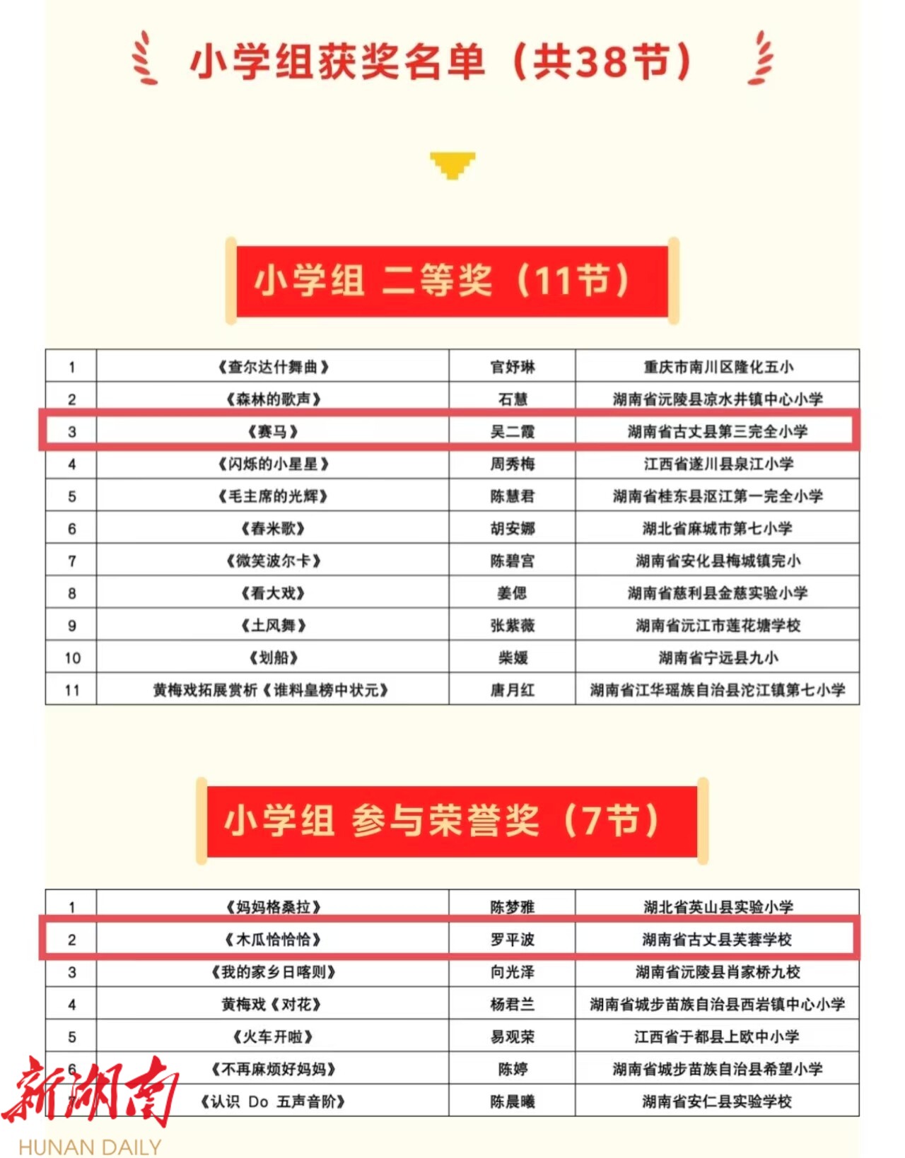 其中,古丈县第三完全小学吴二霞老师执教的《赛马》荣获小学组二等奖;古丈县民族中学张雪晴老师执教的《世界民族音乐博览会》(第二课时)荣获中学组三等奖;古丈县芙蓉学校罗平波老师执教的《木瓜恰恰恰》获得小学组参与荣誉奖。这些获奖课例体现了执教教师扎实的专业功底、精心的教学设计和良好的课堂驾驭能力,是音乐教育优质教学实践的优秀代表。