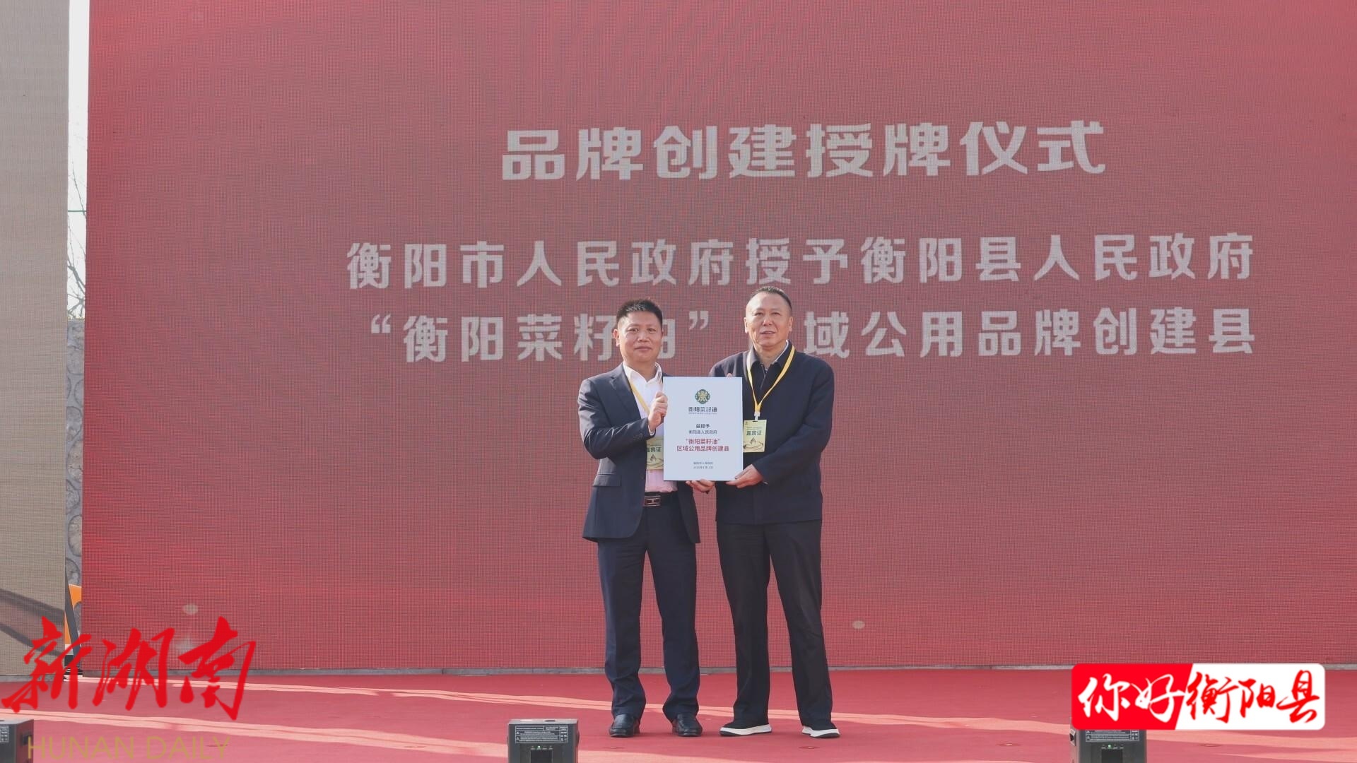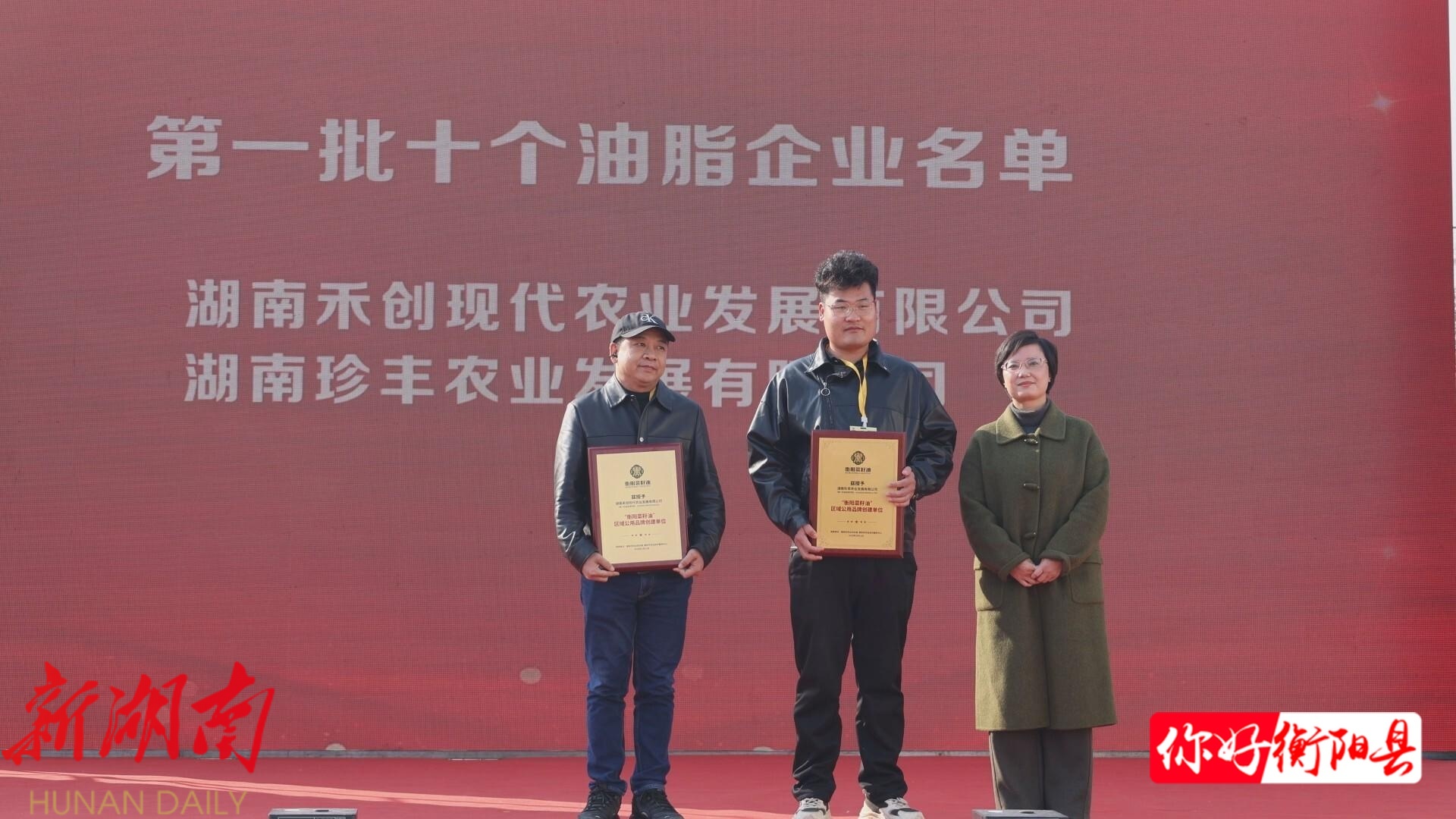 现场,衡阳市政府授予衡阳县“衡阳菜籽油”区域公用品牌创建县称号。衡阳东方天润农业科技有限公司、衡阳安合农业服务有限公司、衡阳县共兴油脂有限公司等10家油脂企业,获评首批“衡阳菜籽油”区域公用品牌授权企业。