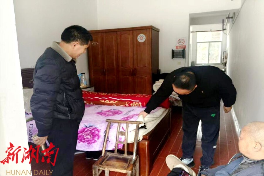 在夷望溪镇敬老院,镇社会事务中心主任向涛为老人送去慰问物资,之后来到老人房间嘘寒问暖,最后对院内的消防、食品、用电用火等设施安全进行了全面细致的检查。