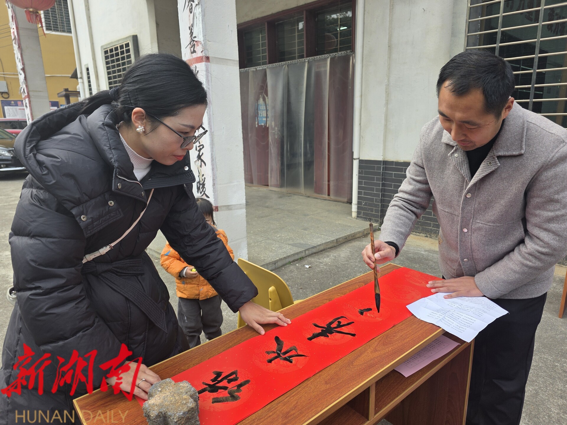 新桂阳1月12日讯(记者 李玮嘉 )1月10日,方元镇方元社区居委会联合镇新时代文明实践所,邀请县书法家协会的书法爱好者开展新春送对联活动。