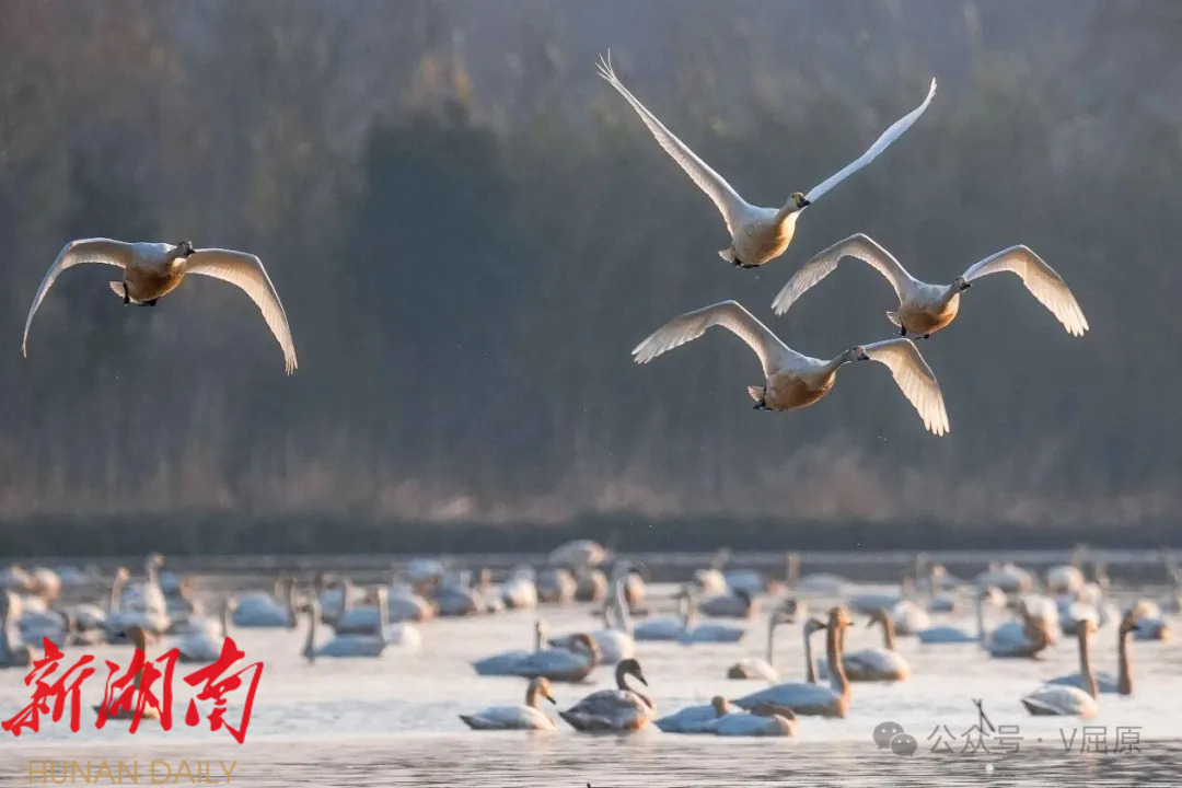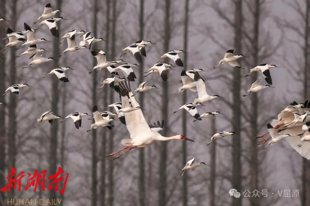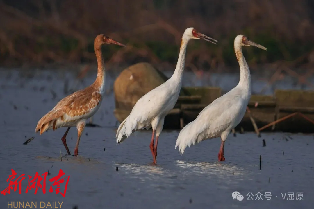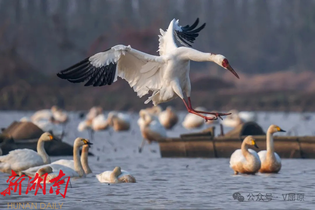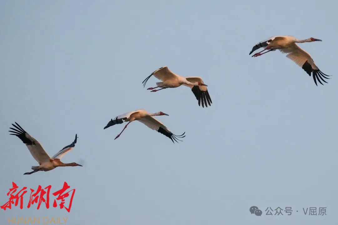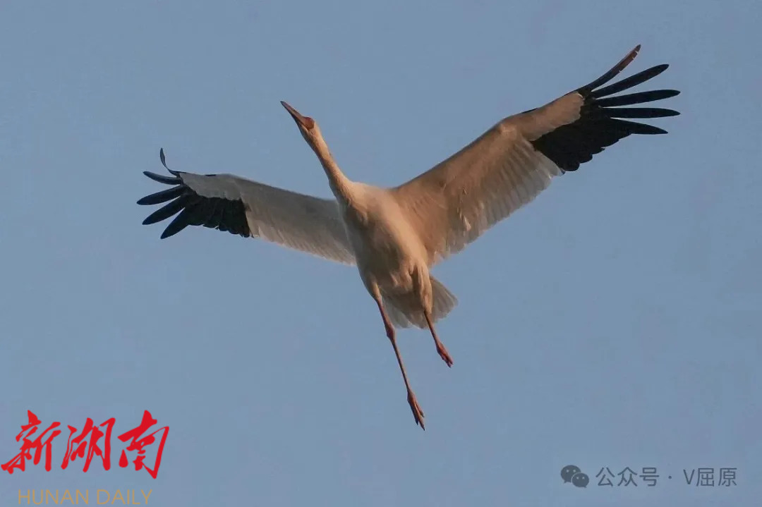 白鹤作为国家一级保护动物,堪称珍稀濒危物种的“活化石”,据权威机构统计,全球总量仅约5000只,因其稀缺性被誉为“鸟中大熊猫”。屈原管理区东古湖自2021年冬季首次发现白鹤栖息越冬以来,这里便成为湖南省白鹤群体规模最大的越冬栖息地。2023年2月,屈原融媒体中心记者曾在此记录到103只白鹤,叠加周边区域种群,当地白鹤总量超300只;2024年,东古湖及周边白鹤数量有所回落,约100只;2025年12月初,白鹤再度如期而至,数量从最初的十余只逐步稳步增长。2026年1月11日至12日,记者连续两日蹲点观测,通过长焦镜头计数,确认此处白鹤总数已突破120只。据近期态势推测,未来一个月内,白鹤数量有望持续增长,甚至可能突破2023年300只的历史峰值。 观测过程中,一幕温情场景令人动容:记者意外记录到一只腿部明显残疾的白鹤。在东古湖上空一组6只白鹤同步飞翔的队列中,这只白鹤并未像同伴那般双脚并拢优雅滑翔,而是双腿分叉拖行。起初,观测人员推测其可能腿部受伤,待放大照片细致核查后发现,这只白鹤两条腿明显长短不一,大概率是先天残疾所致。即便如此,它仍能紧跟家族飞翔步伐,展现出顽强的生命力。 候鸟的持续集结,离不开生态环境的持续优化。今年冬季,屈原管理区进一步加大东古湖生态保护与候鸟守护力度,通过一系列精准施策,让湖区生态环境愈发优良,不仅吸引了越来越多的候鸟前来栖息,也成为观鸟爱好者的打卡胜地,累计接待观鸟游客超20万人次。从万鸟齐飞的生态盛景到白鹤归来的珍贵画面,东古湖的生态变迁,正是岳阳市“守护好一江碧水”理念落地生根的生动诠释,也让生态保护带来的绿色红利惠及更多人。