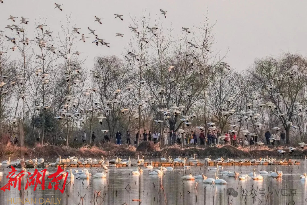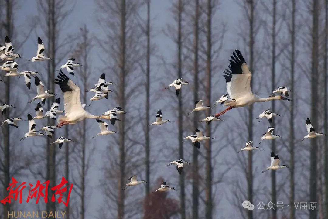 湖南日报·新湖南客户端1月13日讯(通讯员:宋政军)入冬以来,岳阳市屈原管理区东古湖俨然成为候鸟的“越冬天堂”。万只西伯利亚小天鹅翩跹而至,候鸟种类与数量也在持续攀升,除小天鹅外,反嘴鹬、鹤鹬、黑翅长脚鹬、白骨顶鸡、针尾鸭、凤头麦鸡、苍鹭、白鹭等鸟类也相继大规模集结,1月12日,融媒体记者在此还成功记录到超过120羽白鹤的身影,这些“鸟中精灵”与小天鹅、各类鹬鸟、雁鸭同湖嬉戏、共舞长空,将东古湖渲染成一片灵动多姿的鸟类世界。